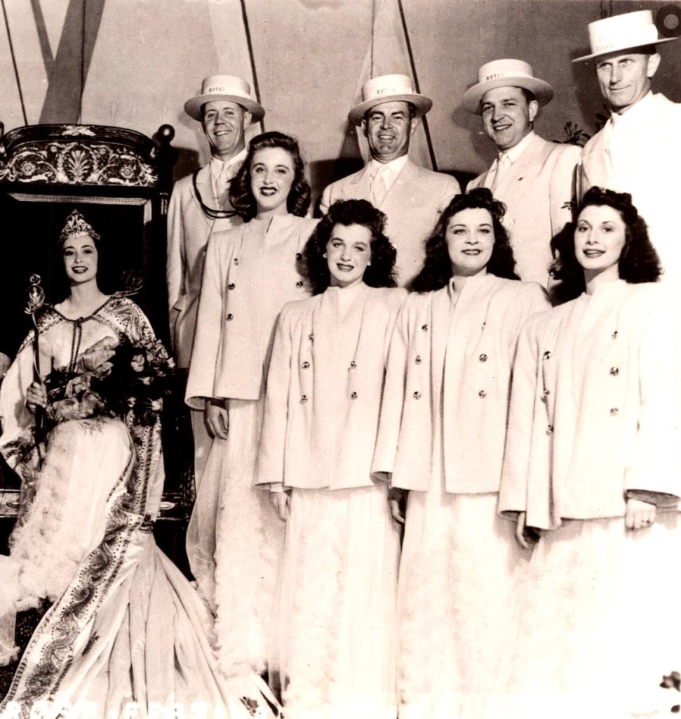 This vintage real photo postcard features the Queen of the 1947 Portland, Oregon, Rose Festival. The newly crowned Queen is named Georgene. She is pretty and is flashing a wonderful smile. She looks majestic wearing her crown, dressed in a royal robe, and clutching a large bouquet of roses. The festival has an interesting history. The Portland Rose Society was founded in 1888 and the group began with a backyard rose show. By 1902 the society was hosting a parade and pageant, in addition to the rose show. The first Rose Festival and Flower Parade was held in Portland in 1906. The parade included decorated floats, wagons, people and horses. The first “official Porland Rose Festival occurred in 1907. The Rose Festival Parade included an “electric parade” of illuminated floats. In 1930, the festival began selecting a Rose Festival Queen. The Queen was selected from a group of nominees representing local high schools. These high school seniors were called princesses. Research reveals that the young woman pictured on this photo portrait postcard is Georgene Ormston. She was a student at “Girls Poly” high school in Portland. (SOLD)