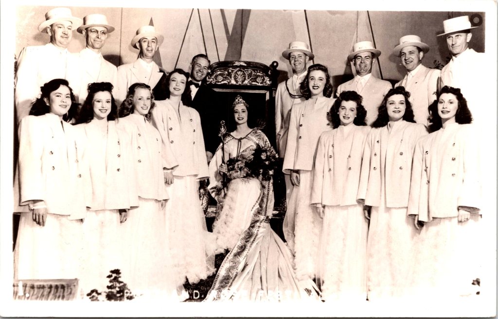 This vintage real photo postcard features the Portland Rose Festival of 1946. The photo shows the Queen of the festival seated on her throne. She is surrounded by her court. SOLD