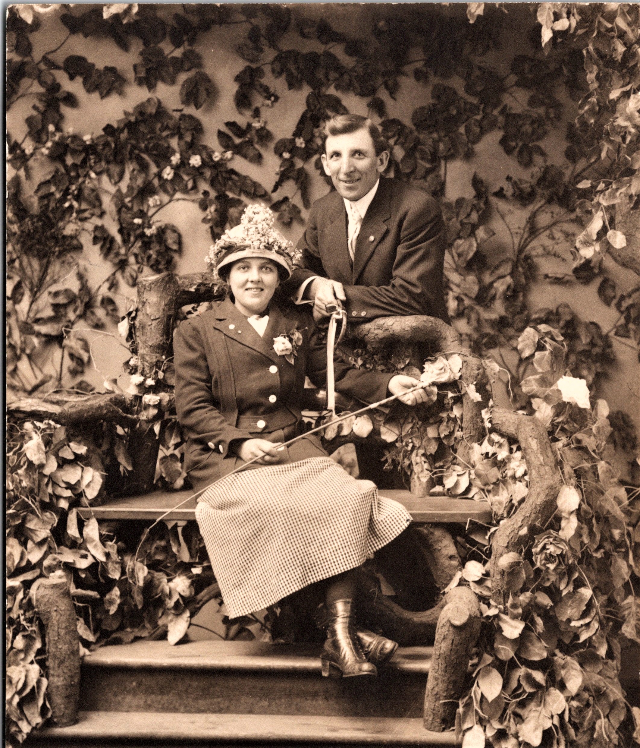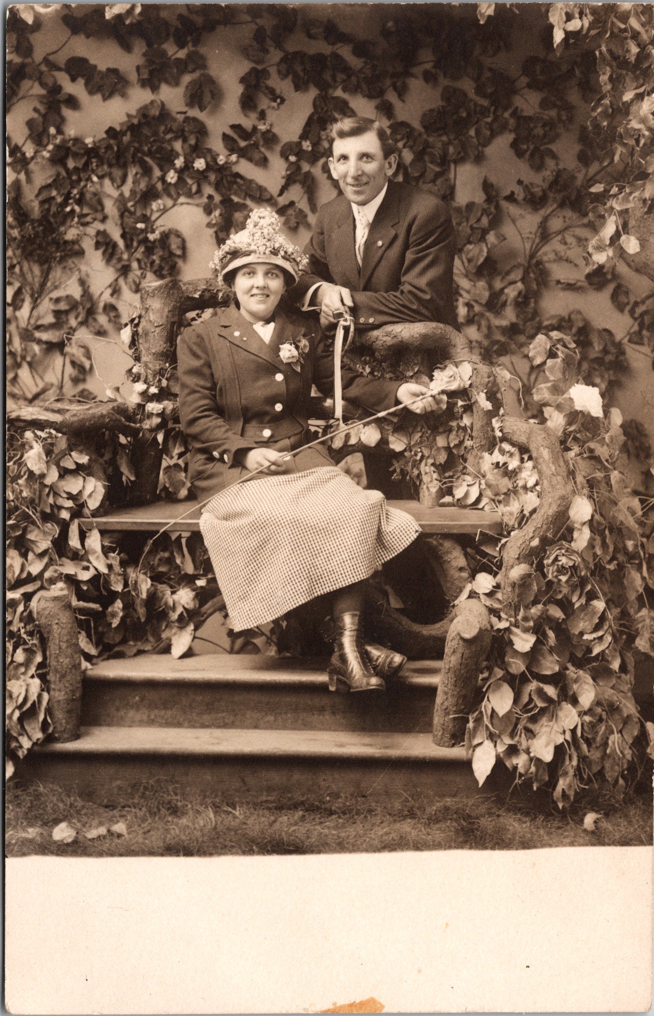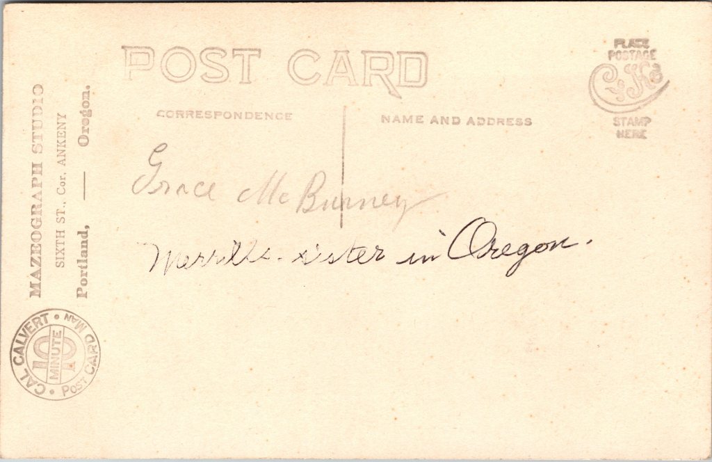 This vintage real photo postcard (RPPC) features a smiling couple posing in a photographic studio’s faux garden. Note the leaves affixed to the wall behind them. This couple seems very happy together but they apparently didn’t maintain their marital harmony because they ultimately got divorced. One hopes that the whip that the woman is holding had nothing to do with their marital discord. The woman’s name in this photograph is Grace McBurney. Her name is written on the reverse of the postcard, undoubtedly by one of her relatives. Research reveals that Grace R. McBurney (1893-1969) was born in Oregon and married at the age of 19 to William H. McBurney who worked as a “typewriter representative”, which I assume means he sold typewriters. The couple had at least five children: Virginia D.(born around 1914), Marguerite F. (1919-1999), Wilma (born around 1920), William (1923-1981), and Carl Morton (1928-2007). Perusal of US census data reveals that the couple were divorced sometime between 1930 and 1940. It appears that Grace lived her entire adult life in Portland, Oregon. She is buried in Lincoln Memorial Park in Portland. Preliminary research yielded little information about her husband. This photo postcard was produced by the Mazrograph Studio in Portland. Mazrograph was the process Calvert used to produce the photo postcards quickly. The studio’s stamp can be seen on the reverse of the postcard. The stamp also mentions that the photo production process took only ten minutes.The postcard paper was produced by Cyko sometime between 1906 and 1915. Charles E. (Cal) Calvert operated his studio at Sixth and Ankeny from 1906 through 1930. In 1907, with the opening of Council Crest Amusement Park, he operated a studio and postcard stand on it’s grounds. He also ran a studio at the Washington Street entrance to Portland’s City Park in 1910. Cal was known for his use of rustic props and for his creativity. One of his sets involved subjects appearing as if they were flying an airplane over the city of Portland. A postcard employing this setting is part of a collection at the Portland Art Museum. This RPPC was taken in a “10 Minute Photo Gallery”. The reverse of the card advertises “Cal Calvert, Postcard Man”. As a side note, there was also a Calvert’s Studio across from Oregon City’s Southern Pacific Depot but it was run by Harry Calvert and his wife Alvilda. Harry was not related to Cal Calvert. Harry’s studio operated from 1915 through 1925. This vintage real photo postcard is in very good condition (see scans).