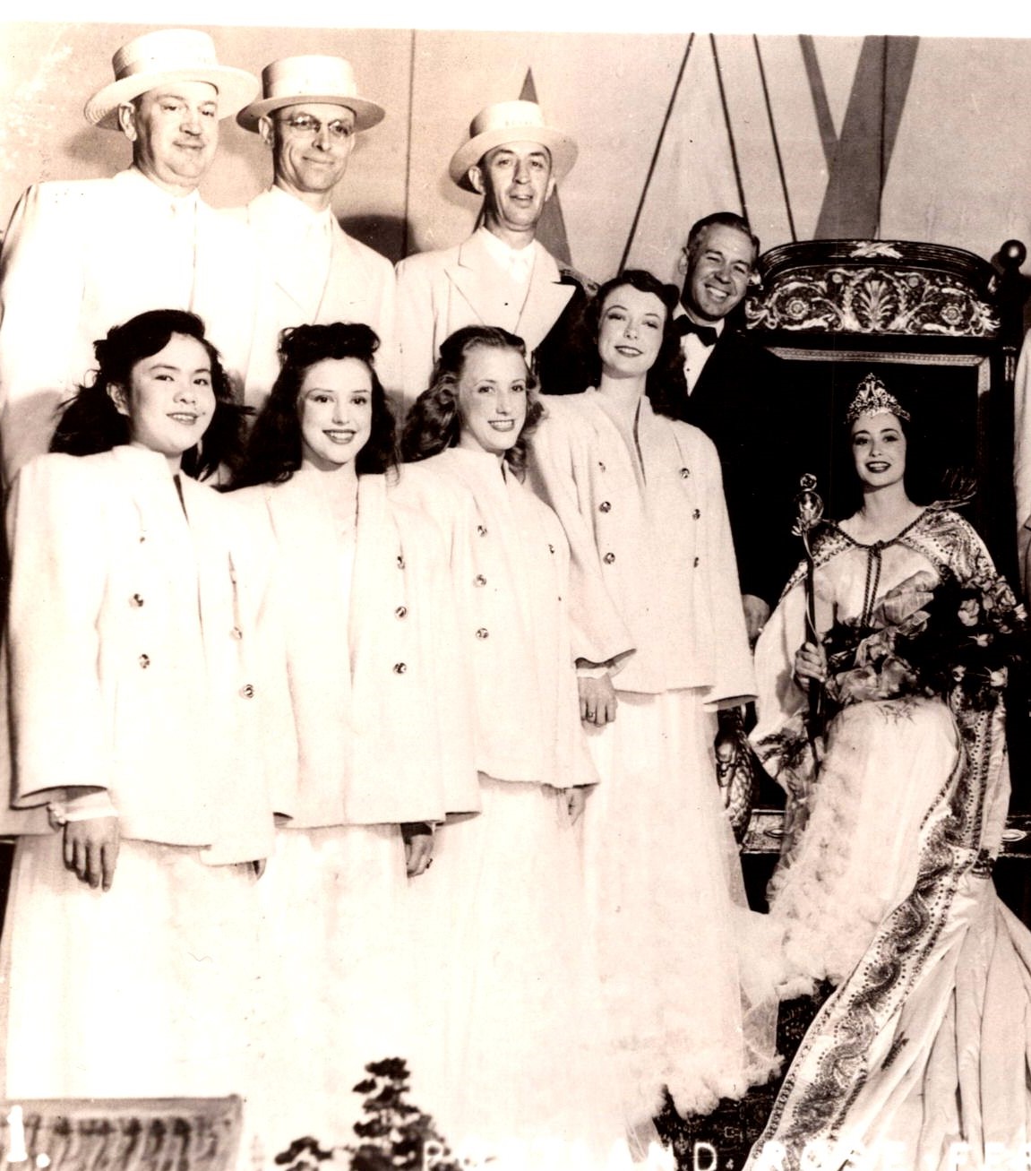 This vintage real photo postcard features the Portland Rose Festival of 1946. The photo shows the Queen of the festival seated on her throne. She is surrounded by her court. SOLD