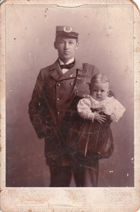 This unique cabinet card features a mailman delivering a baby. Alright, he’s not delivering the baby using traditional child birth techniques. He is delivering the baby from his mail pouch. The mailman is dressed in his full uniform and he has a relatively serious expression on his face as he poses for the photographer. The baby’s facial expression can best be described as “sour”. The cameraman is Frank C. Weston, located at 2 Smith Block, of Bangor, Maine. Weston was a native of Maine who established himself as a photographer in the late 1870’s. His prices were “dictated by a spirit of moderation”, and he was the preferred photographer among the African American community of Bangor.