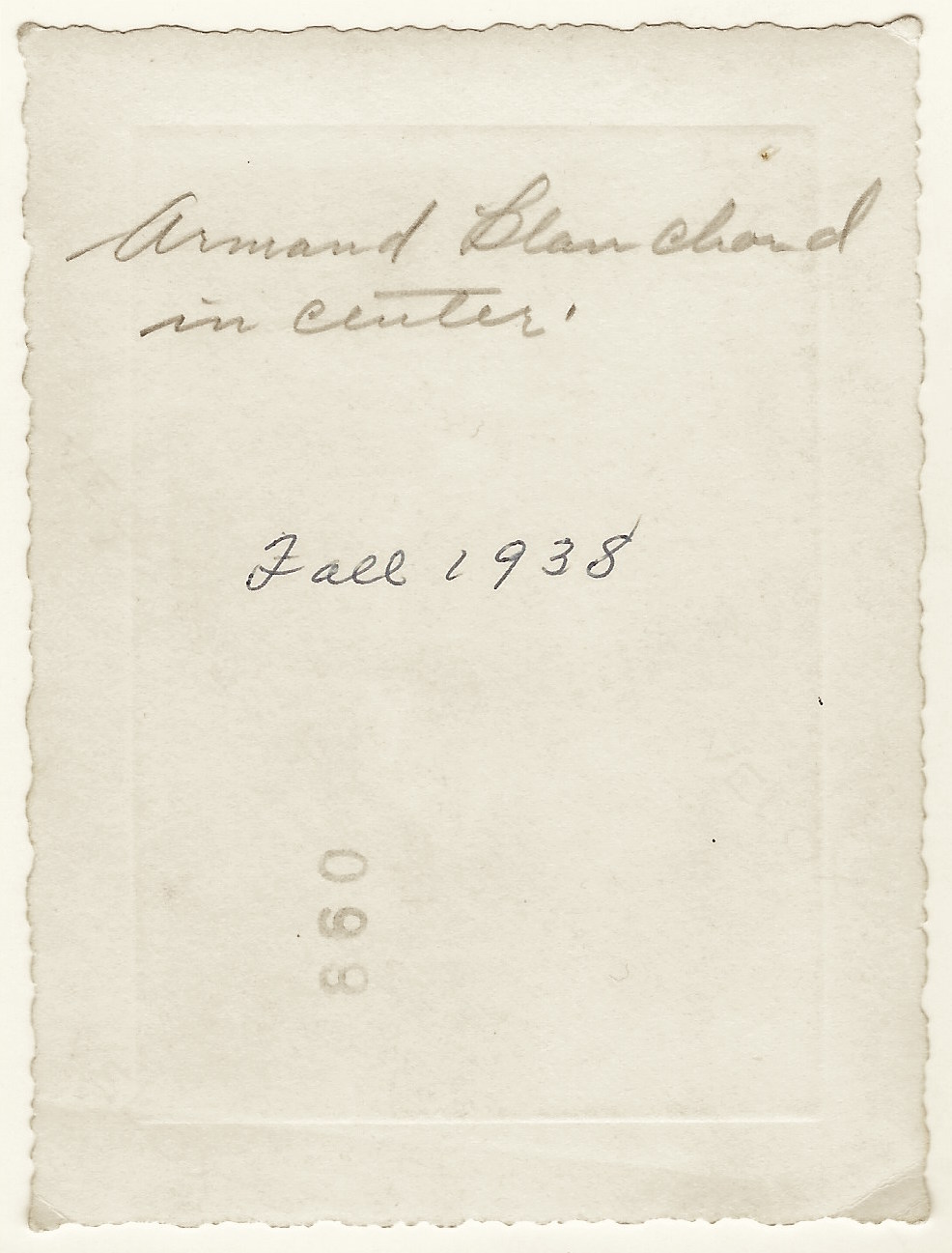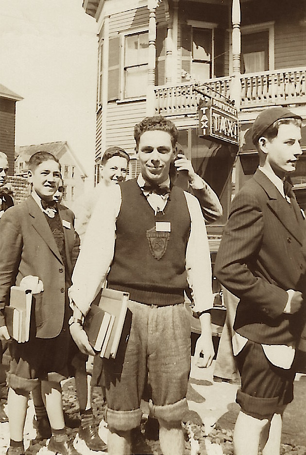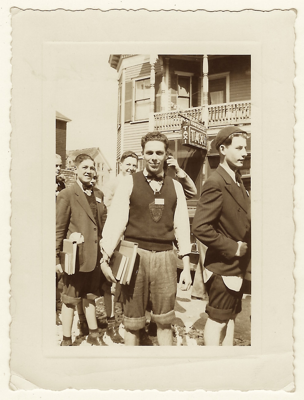 This vintage snapshot features a group of students holding their books and wearing name tags. At least two of the young men are wearing sweaters with an emblem stating “Textile”. Is textile the name of their school? Rhode Island is, and was, known for its textile industry. Do the students attend Rhode Island School of Design (RISD) in Providence? The school is a private art and design college and offers a major in Textiles. The school has been in existence since 1877. In the background of the photograph is a Taxi business sign revealing that the location of the photo is Pawtucket, Rhode Island. Writing on the reverse of the photo declares that the photograph was taken in the fall of 1938. The boys are unintentionally making a fashion statement. Note their rolled up pants legs. This fashion strategy even applies to the students wearing sport jackets. The boy on the far right has the same affliction that I experience. He too, can’t keep his shirt tucked in. The reverse of the photo reports that the young man in the center of the photo is named Armand Blanchard. This snapshot photograph is in very good condition (see scans).
