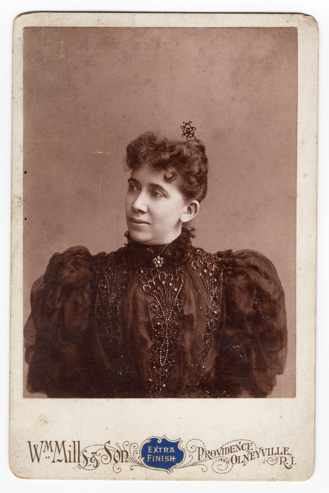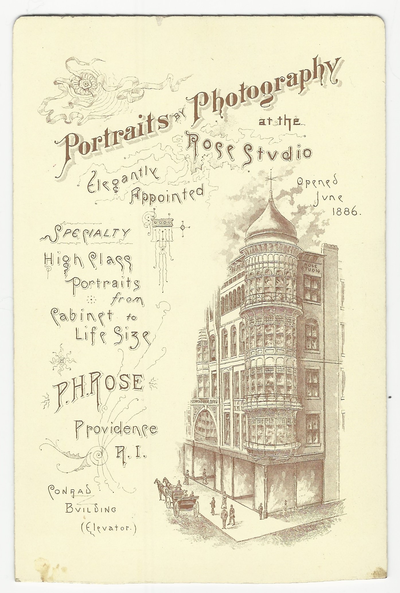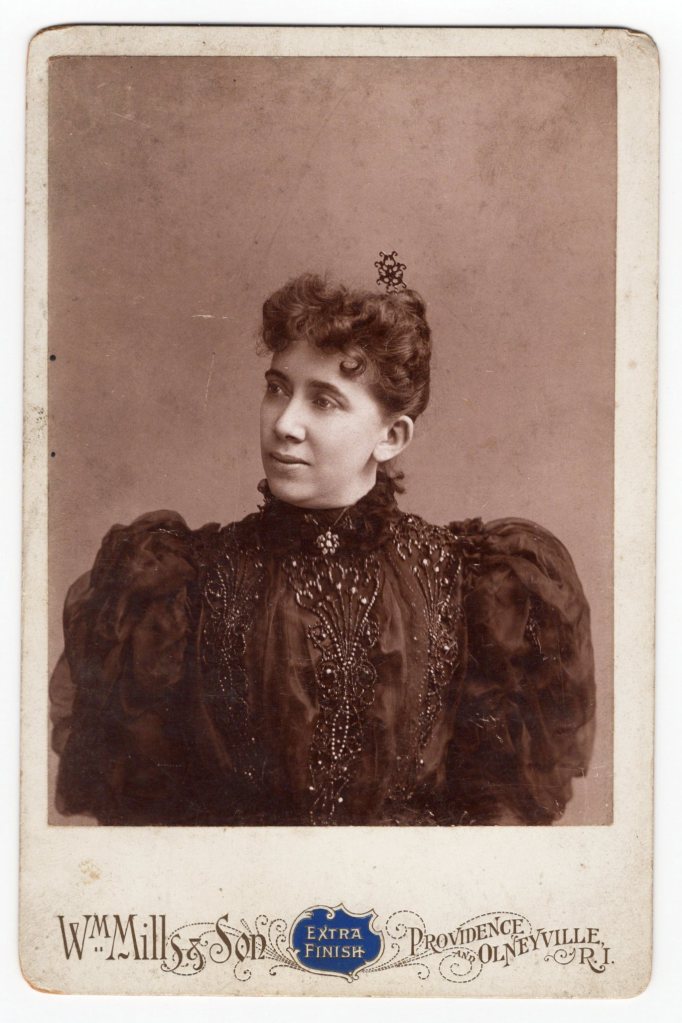 The fifth portrait of Julia Marlowe appears to be a photograph of the actress in costume for an unknown stage production. The image was photographed by Ye Rose Studio of Providence, Rhode Island. The reverse of the card indicated that the studio was opened in 1886. The studio was located in the Conrad building in downtown Providence. The building still exists. Other photographs by the Ye Rose Studio can be viewed by clicking on the category “Photographer: Ye Rose”.