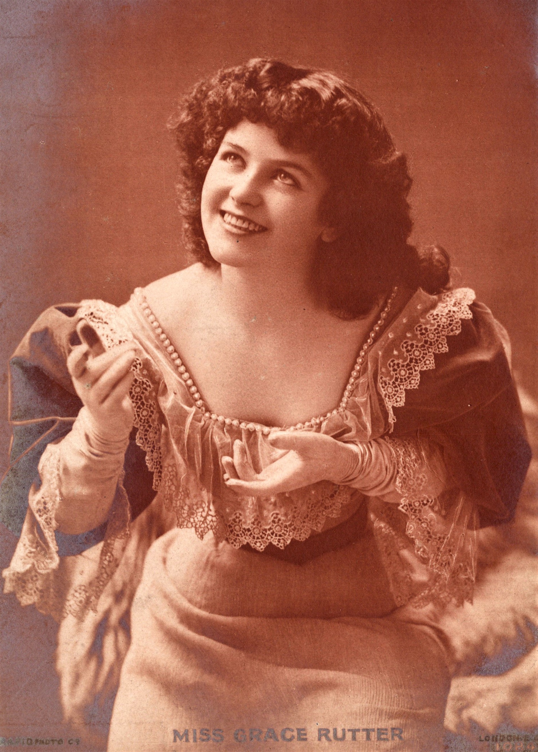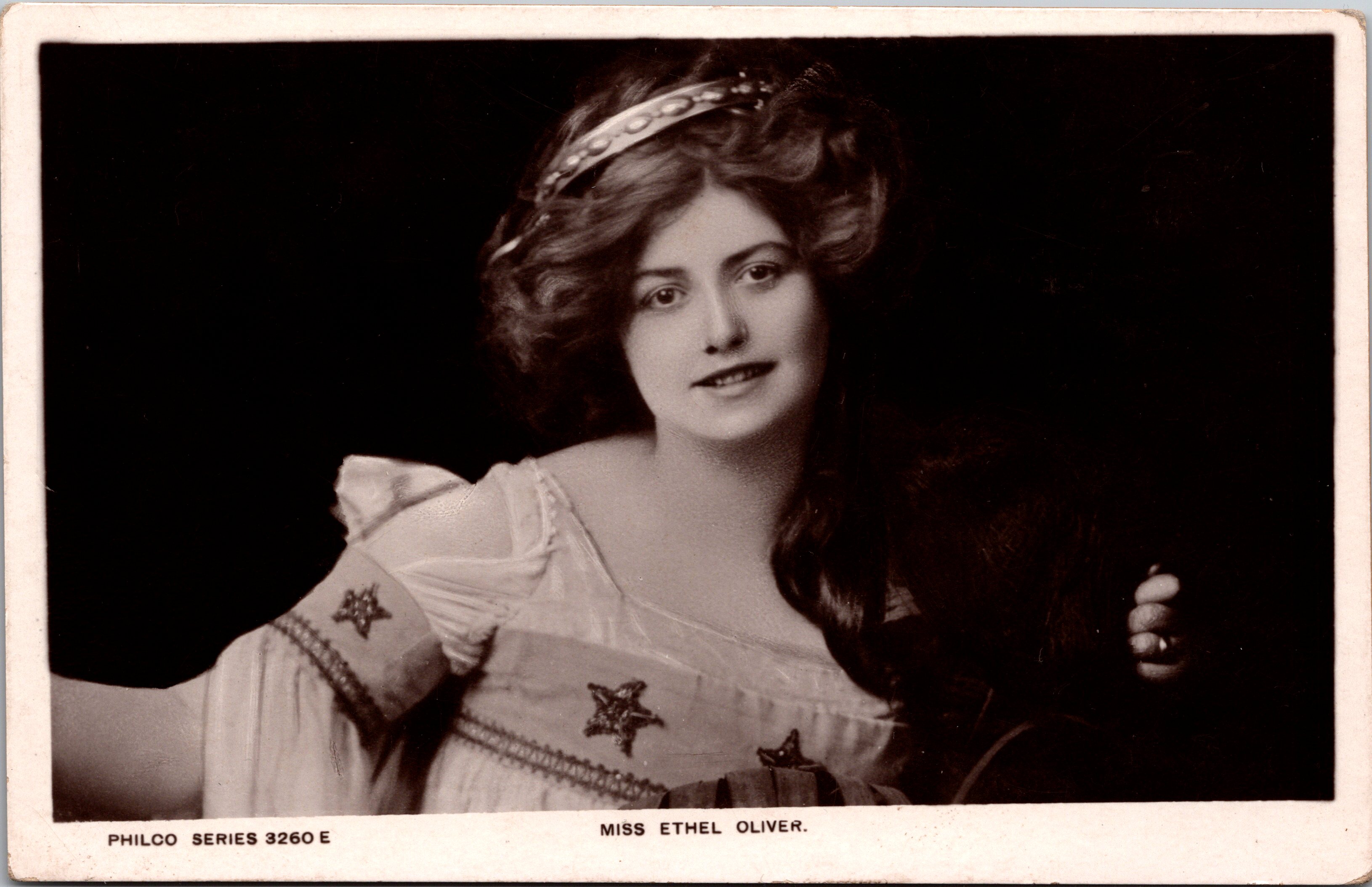 Postcard 2 is a risque vintage postcard, published by Rotary Photo and numbered 1945G in the series, features Miss Kitty Malone in an elaborate theatrical costume. This card earns the title of risque because Miss Malone’s top is exceedingly short, exposing much of her legs. The photograph was taken by the renowned Foulsham & Banfield studio. Miss Malone is dressed in an ornate, short tunic-style dress adorned with intricate embroidery and decorative trim. The outfit is cinched at the waist with a bejeweled belt, and she wears sheer, flowing sleeves that drape elegantly from her arms. She also sports shimmering stockings, one of which is embellished with a delicate garter, and dainty, pointed shoes. Her regal headpiece, topped with tall, white feathered plumes, adds to the opulent and theatrical nature of her attire. Her expression is warm and confident, with a slight smile and a poised demeanor. She gazes directly at the camera, her head tilted slightly to one side. Her dark, voluminous hair is styled in an elegant updo, framing her face beautifully. Her pose, with one hand resting on her hip and the other raised near her face, conveys a sense of grace and charisma, suggesting she was a performer or stage actress. The background of the image is softly blurred, allowing the intricate details of her costume and expression to stand out. The overall aesthetic of the postcard captures the glamour and theatrical style of the era. SOLD