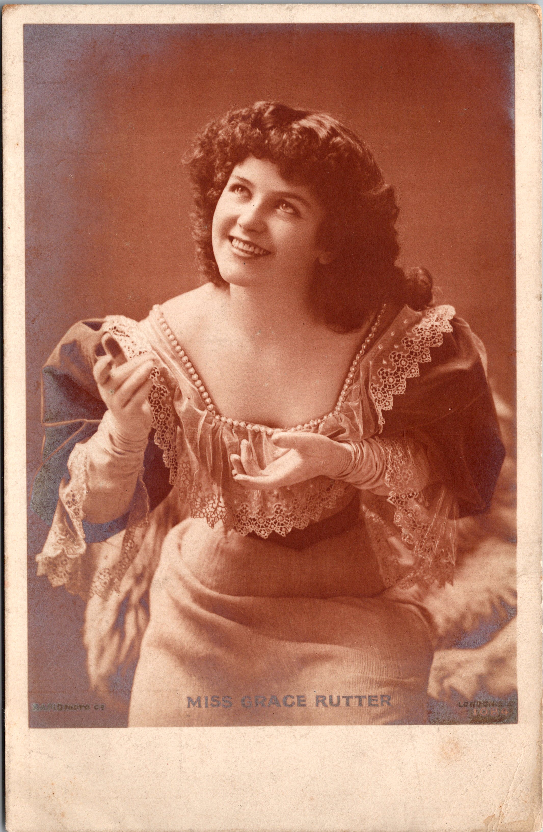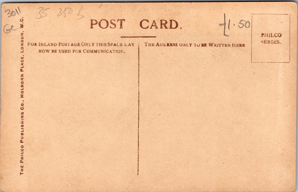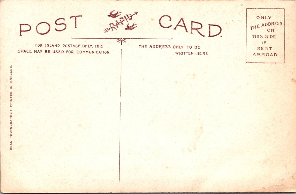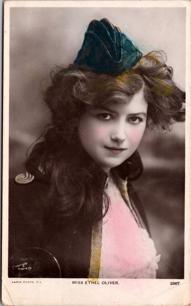 Postcard 1 is a risque original real photo postcard (RPPC) featuring Miss Kitty Malone, an early 20th-century stage performer or model. Malone is wrapped in a tight gown that accentuates all of her curves. The postcard was produced by Rapid Photo Co. in London, with the photograph taken at Dover St. Studios. In the image, Miss Kitty Malone strikes a dramatic pose, wrapped in a flowing, textured gown reminiscent of Grecian or theatrical costume styles. Her long, voluminous dark hair cascades down her shoulders, framing her striking face. She gazes directly at the camera with an intense and almost mysterious expression, her lips slightly parted. Her arms are lifted behind her head, adding to the dramatic, posed aesthetic that was characteristic of early Edwardian stage and artistic photography. This postcard is part of a series and numbered 2676 . This antique real photo postcard (RPPC) was postally used and sent in 1908. It features a green half-penny King Edward VII postage stamp, which was commonly used in the early 20th century for domestic postcards. The handwritten message is addressed to Miss V. Green and is written in black ink in elegant cursive handwriting. The sender, signed as “Aunt Emma”, writes to Violet, mentioning that she has received a postal order (P.O.) safely and hopes Violet and her mother are doing well. She asks if Violet’s mother has any homemade wine available and requests that she let her know by Sunday so she can send for a bottle. Aunt Emma also states that she will send money so it can be delivered by carrier on Wednesday, mentioning that she finds it beneficial for herself and thought Violet’s mother might feel the same. SOLD