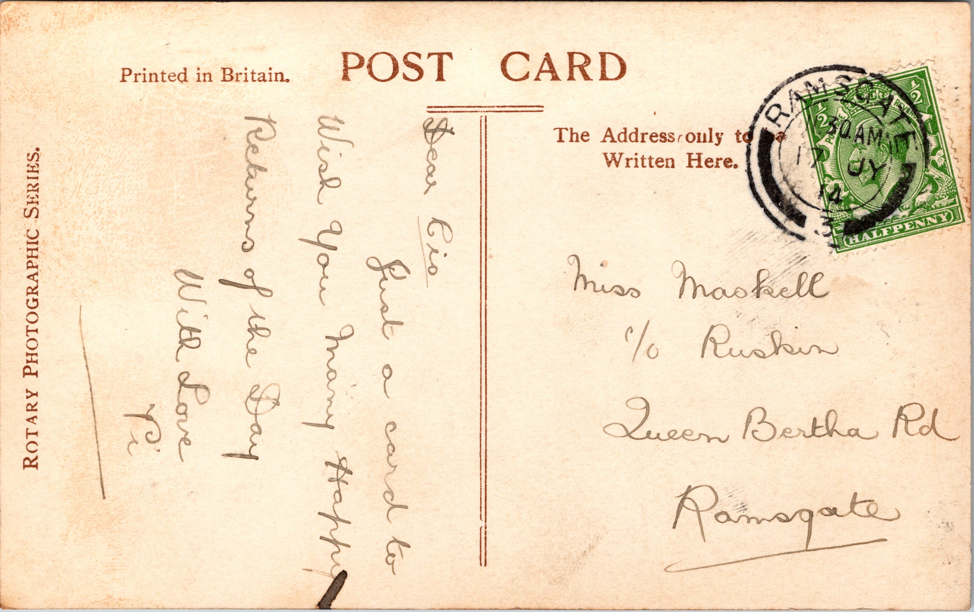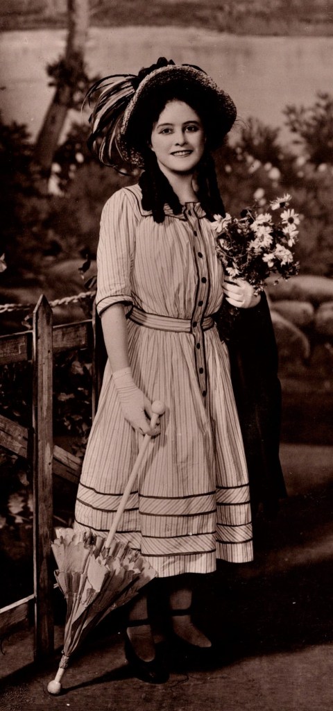 This vintage real photo postcard features actress Edith Taliaferro (1894-1958). She was an American stage and film actress in the late 19th and early 20th century. She was active on the stage until 1935. She played roles in three silent films. She is most famous for playing the role of Rebecca in the stage production of “Rebecca of Sunnybrook Farm” (1910). Edith was born in Virginia. Her parents were theatre workers and her sister, Mabel, also became a stage actress. Edith made her stage debut at age two and by the time she was ten, she was performing in productions of Shakespeare. During her career, she performed in more than thirty stage productions. She appeared in sixteen Broadway shows. (SOLD)