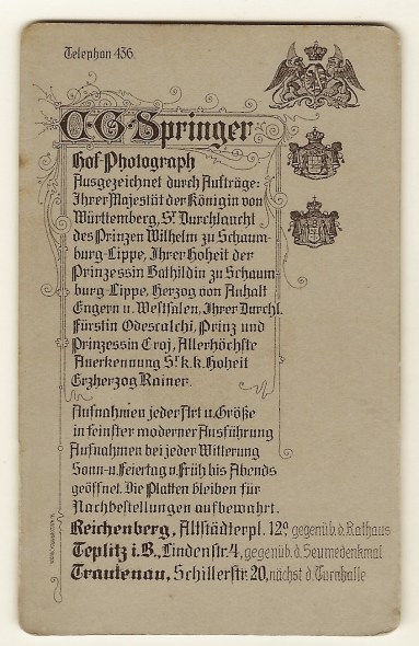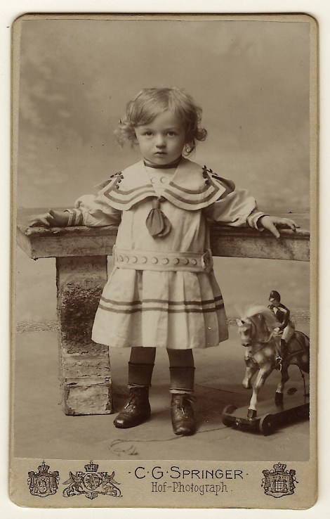 This carte de visite gives center stage to a most adorable little girl. She is standing next to her pull toy, a very detailed jockey and horse. Note the horses realistic looking mane. The toy is on wheels. This photograph was taken at a photo studio belonging to C. G. Springer. Since Mr Springer owned multiple studios, it is uncertain as to which particular location was the producer of this image. All three of Springer’s studios were in Czechoslavokia (Reichenberg, Teplitz, and Trautenau). This cdv photograph is in very good condition (see scans). (SOLD)