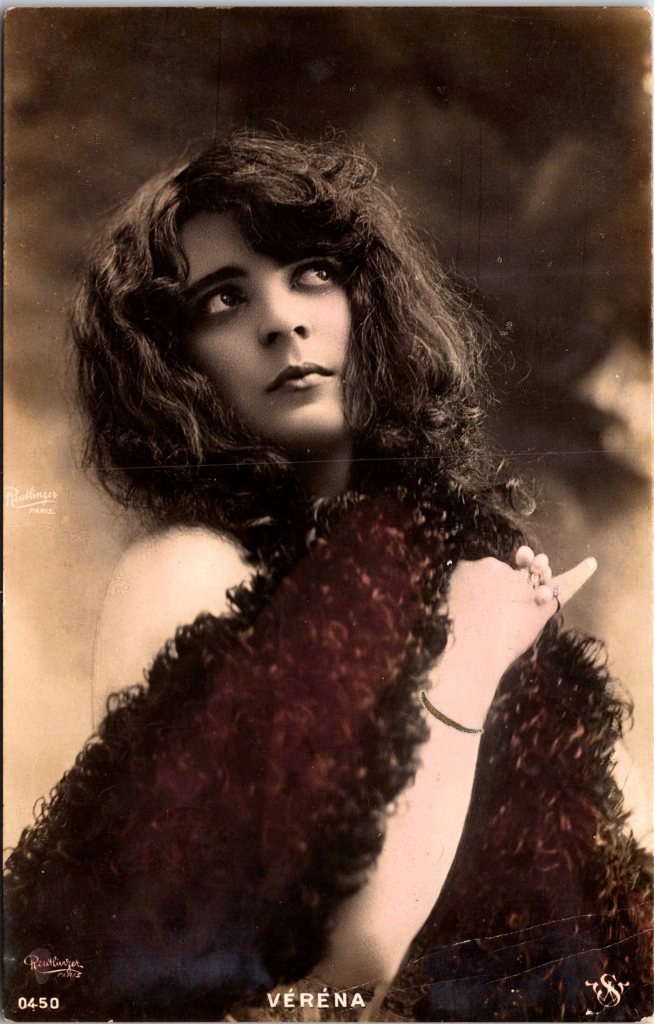 This vintage real photo postcard features Verena, an enchanting and seductive performer captured by the lens of renowned photographer, Leopold Reutlinger. She has long dark cascading hair and she exudes an aura of mystery. Adorned with a feather boa, she reveals a bare shoulder, adding sensuality to this portrait. Verena was one of the early performers at the Folies Bergere. This postcard is part of a series (no.0450). SOLD