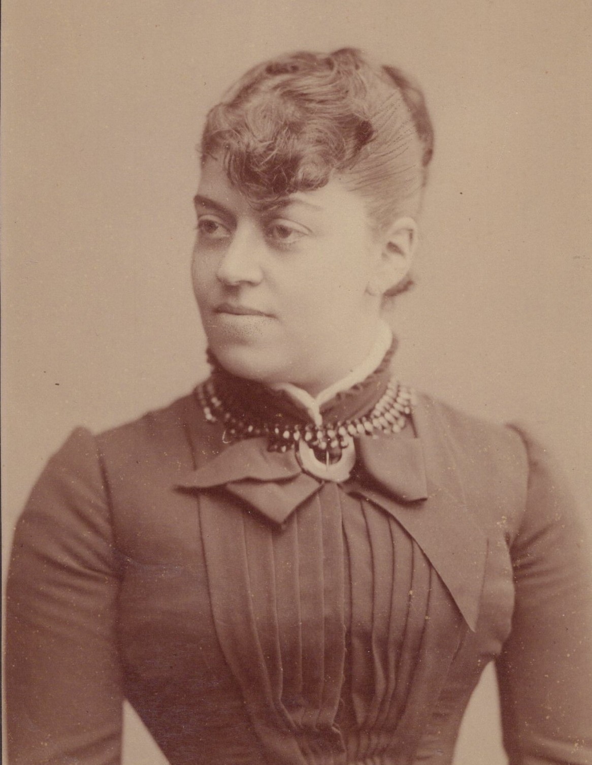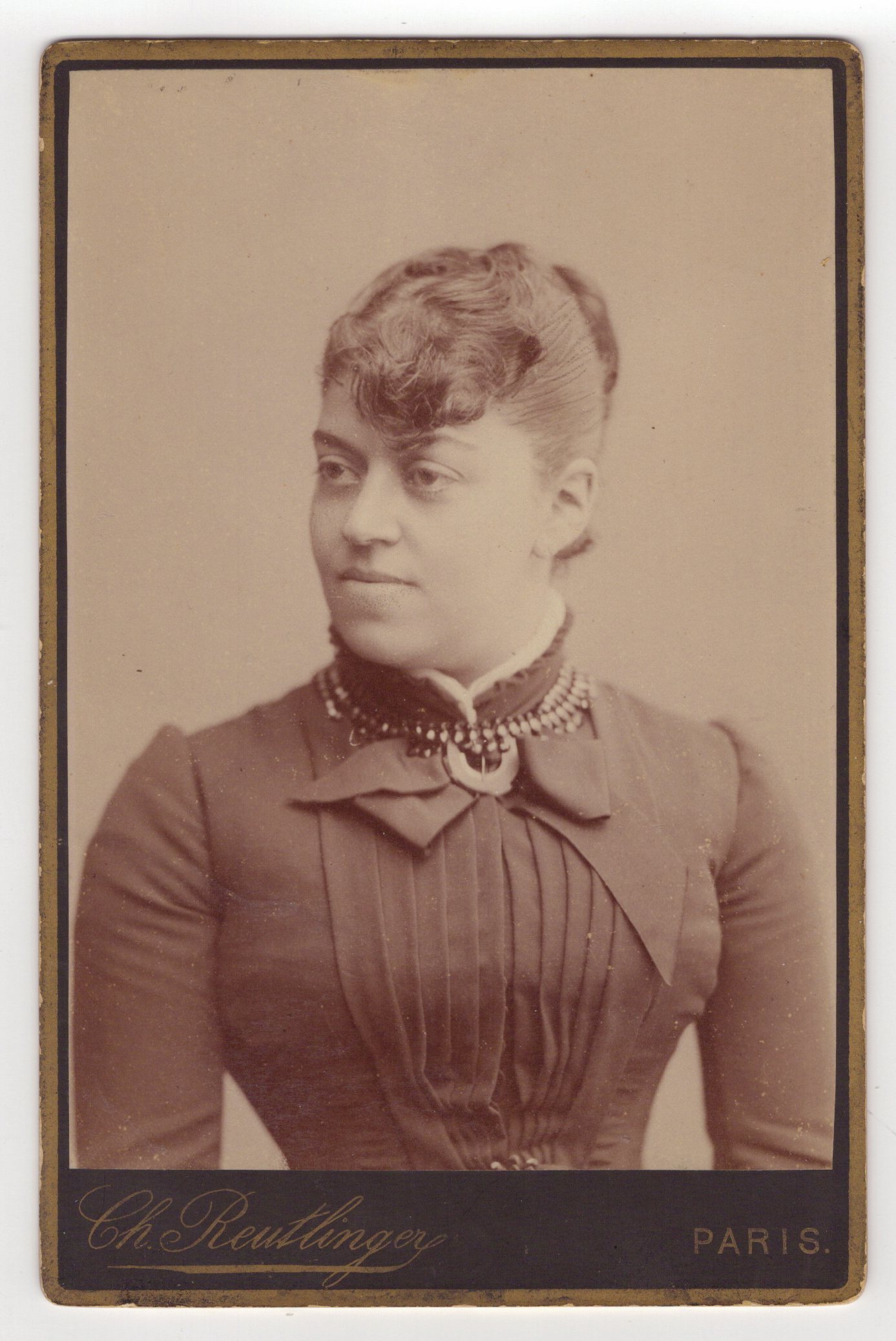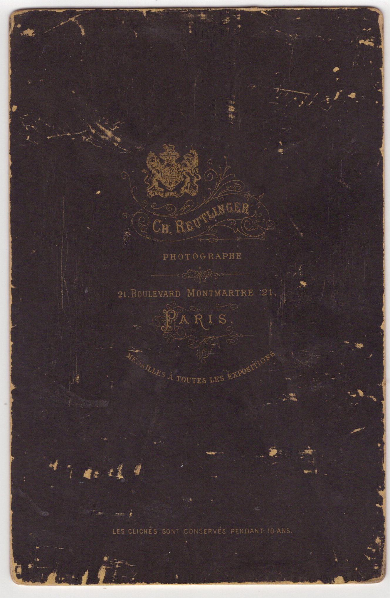 This cabinet card features a portrait of a young woman who appears to be French African. She is well dressed and her hair is well coiffed. She is wearing a beaded necklace and a bow at her collar. Her figure is enhanced by a corset. The photographer who took this portrait of this lovely woman was the celebrated photographer, Charles Reutlinger (1816-1881). Charles Reutlinger was part of a prominent and talented family. Charles Reutlinger was of German descent and founded the Reutlinger Photography Studio in Paris in 1850. The studio took photographs of many of the city’s rich and famous residents and visitors until 1937. The British Journal of Photography (1867) provides a wonderful description of Reutlinger’s studio. Charles’s brother Emile took over the studio in 1880 and he ran it until 1890. Emile’s son, Leopold took over in 1890 and among his accomplishments was that he developed the company’s esteemed and economically successful postcard business. The studio became known for it’s unusual art nouveau style of postcard designs. These were very notable in it’s portraits of actresses. Leopold also introduced risque/erotic postcards. He operated the business until losing an eye in an accident with a champagne cork in 1930. He died seven years later. SOLD