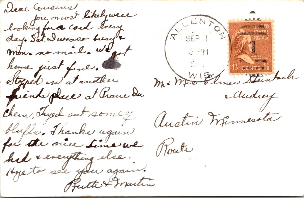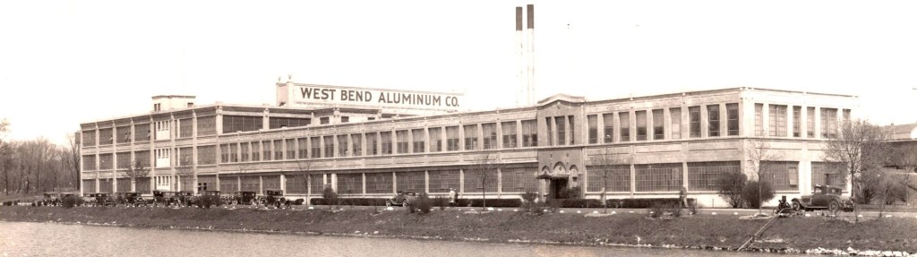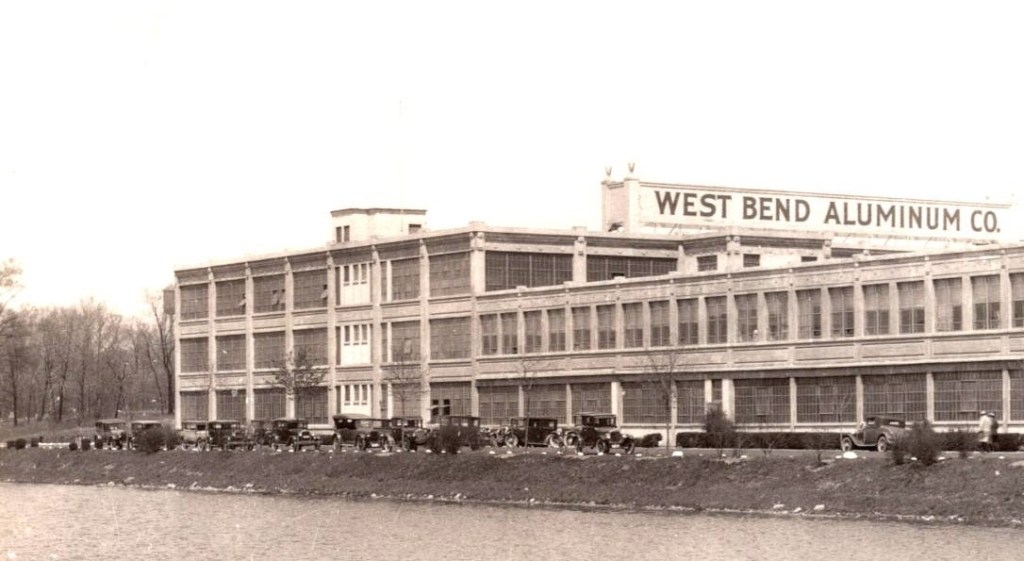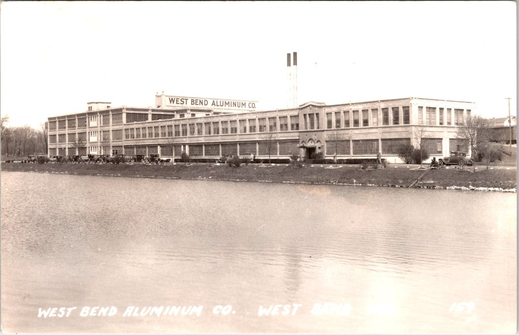This vintage photo postcard features the West Bend Aluminum Company, located in West Bend, Wisconsin. In the closeup photo, note the old cars and the workers on property. Most of us associate Wisconsin with cheese, not aluminum cookware. However, in 1920, the state had 50% of the nation’s aluminum cookware market share. Bernhard C. Ziegler (1884-1946) started the company in 1911. The company’s first products were saucepans, a frying pan, and pie pans. Sears accounted for 90% of the company’s sales. In 1921, the company introduced a crockpot, one of their most successful products. In 1922, the company introduced a drip coffeemaker which didn’t require filter paper. During World War II the company transitioned to supplying war materials. The company was purchased by Rexall Drug and Chemical Company in 1968. The company was dissolved in 2002. SOLD
