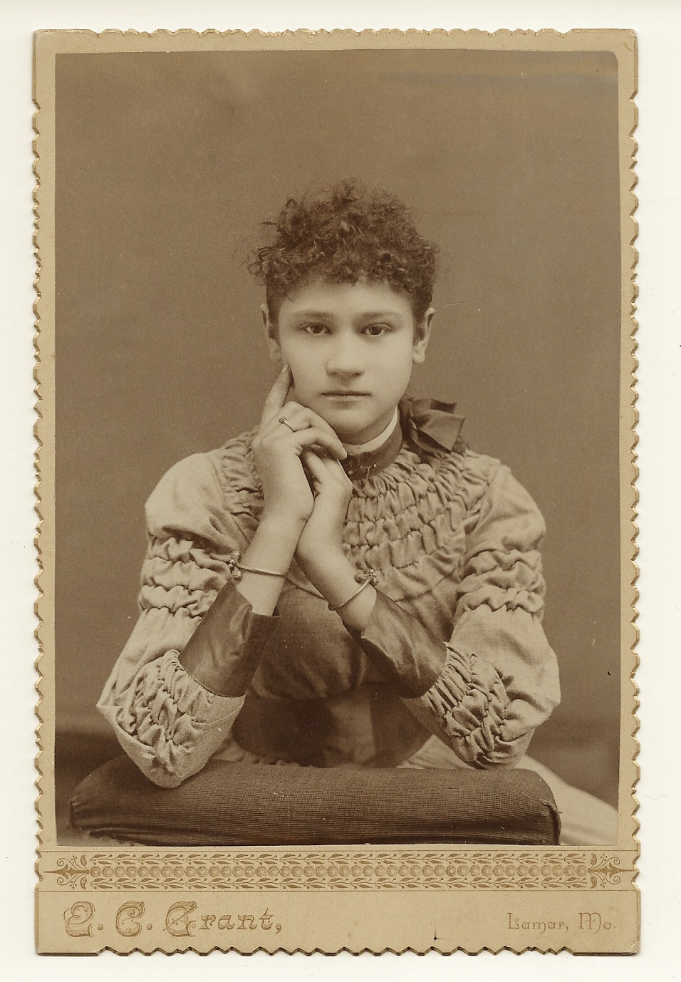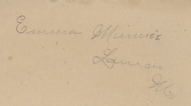 A pretty teenage girl poses for her portrait at the E. C.Grant studio in Lamar, Missouri. She is posed as if she is deep in thought. She is well attired and her dress is quite ruffled. The girl is wearing a bracelet on each wrist and is also wearing a ring. Her name is inscribed on the reverse of the photograph (see below). I believe her first name is Emma but I can not decipher the rest of her name and any help on this endeavor from Cabinet Card Gallery visitors would be welcomed. The photographer of this image is Ezra C Grant (1848-1894). Research revealed that at one time, the address of his studio was “Northwest Corner Square” in Lamar. A book entitled Truman’s Birthplace: Lamar, Missouri, reports that Gustavus Seyffert, the first cousin of the German composer, Richard Wagner, organized the community’s first uniformed band in 1889 and E. C. Grant was one of the players. Ezra Grant died while still a young man and is buried in Lake Cemetery in Lamar Heights. His wife took over his photography business. Belle Grant (1853-?) is listed in the 1900 and the 1910 census as working as a photographer in Lamar. In the earlier census she was residing with her eleven year old son in Lamar. This image has great clarity. Be sure to note the scalloped edges that border the cabinet card. SOLD