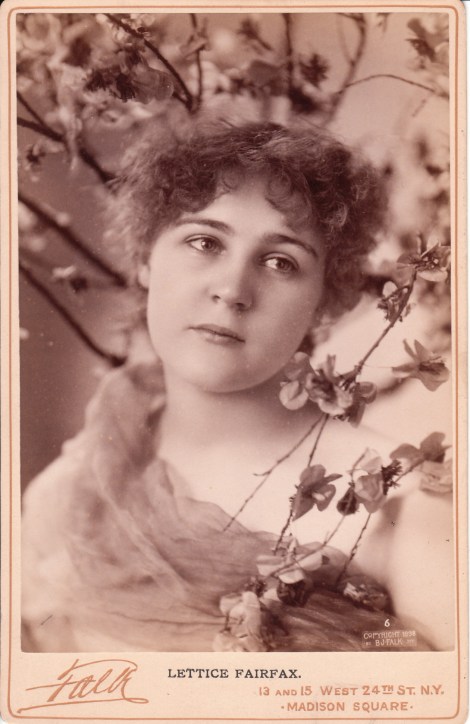 Lettice Fairfax, an English actress, is the subject of this cabinet card. Her first stage appearance in America was at Daly’s Theater in New York City. She had a role in “Number Nine” in December of 1897. The reviewer in the New York Times wrote that she was “a pretty, fragile and very nervous” actress. He also labelled her the “new ingenue” and reported that she was pretty the way an English Gardner’s daughter is pretty. I guess that means that she was pretty in “the girl next door” kind of way. The photographer of this cabinet card was famed theatre photographer, B. J. Falk and the photograph is copyrighted in 1898. The reverse of the cabinet card is stamped “Charles L Ritzmann” of Broadway, New York.