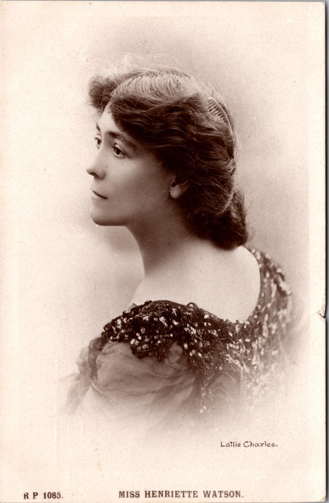 This vintage real photo postcard features British actress, Henriette Watson (1873-1964). Watson was born in Scotland. She made her stage debut at age seven. At sixteen, she was trained and practiced enough to take “second lead” in comedies and modern dramas. As she grew older, larger parts came her way. After appearing in a number of touring and London theater engagements, she joined a touring company on a six month tour of Australia. In 1892 she toured Australia again with the “Mrs Bernard Beere Company”. She appeared in “As in a Looking Glass” with the company.. She toured Australia again in 1899. She later acted in Thornton Wilder’s play, “The Merchant of Yonkers”. Watson’s photo portrait was taken by the celebrated celebrity photographer, Lallie Charles. She was known for her talent as well as the fact that she was a female photographer, an unusual phenomenon for her era. The card is part of the Rival Photographic Series and it was manufactured in England. The postcard was postmarked in 1909. Note the chip on the right border of the card. Accordingly, this postcard is in fair condition (see scans).