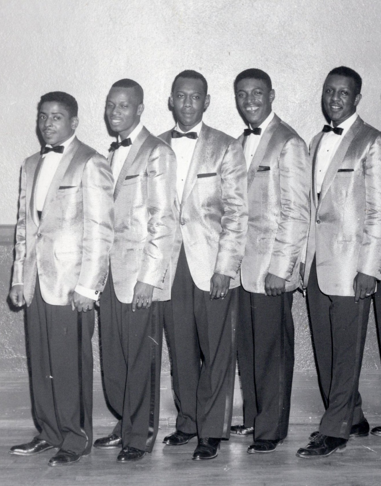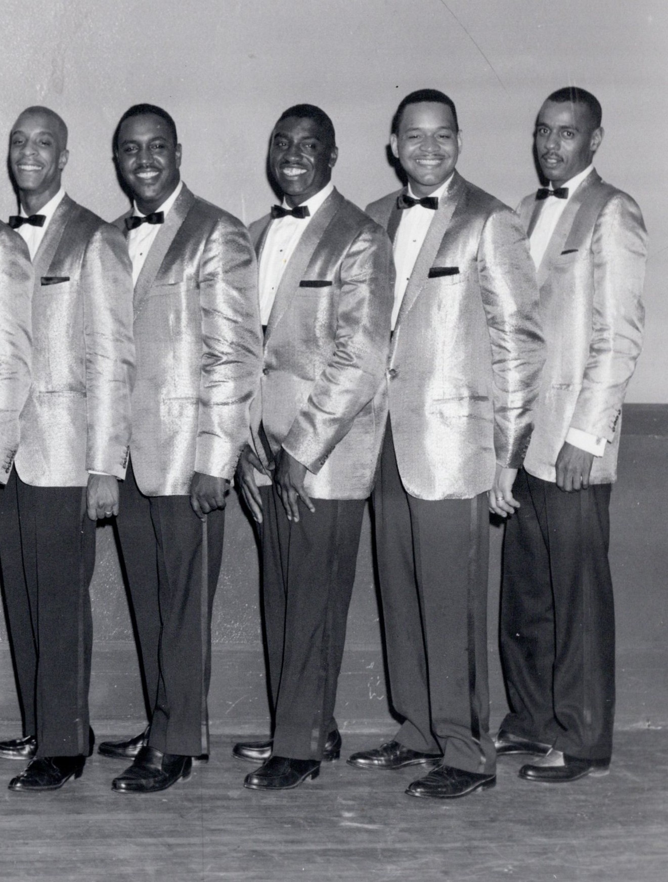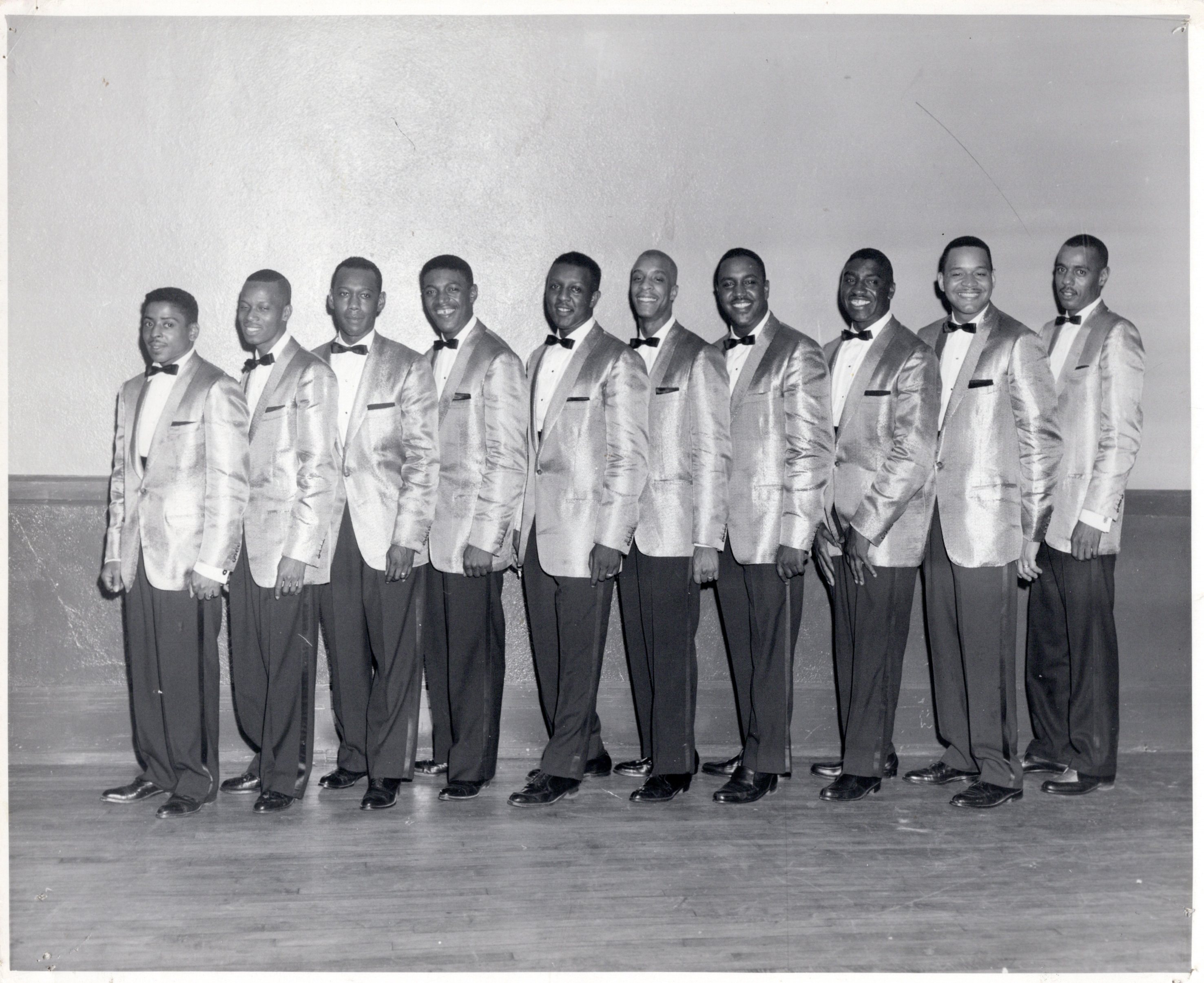 This striking black-and-white photograph, taken by Cleveland photographer Jimmy Baynes (1922–2010), captures a moment of unity, elegance, and pride. The image showcases a distinguished group of African American men, impeccably dressed in matching metallic-toned tuxedo jackets, crisp white dress shirts, and black bow ties. Their tailored jackets gleam under the light, emphasizing their polished, formal appearance. Completing their attire, neatly pressed black trousers and polished dress shoes reflect a commitment to both style and sophistication. Standing in a carefully arranged formation, the men present a sense of camaraderie and professionalism. Their expressions range from confident smiles to serious, poised looks—perhaps reflecting the anticipation of a performance or an important social event. Each man exudes dignity, their upright postures and synchronized attire reinforcing a sense of unity. The background is simple and unembellished, allowing the focus to remain on the subjects themselves, their expressions, and the sharp contrast of their gleaming jackets against the darkened floor. The photographer of this photograph, Jimmy Baynes was  known for his ability to capture the essence of African American life, culture, and entertainment from the 1950s through the 1980s. Originally a postal worker, Baynes pursued photography as a passion, ultimately founding Baynes Foto Service. His work chronicled the vibrancy of mid-century African American social life, from intimate gatherings and beauty contests to the pulsating energy of live music performances and political events. Baynes photographed some of the most iconic figures in entertainment history, including Aretha Franklin, Louis Armstrong, Count Basie, Mahalia Jackson, Louis Jordan, Jerry Lee Lewis, the Platters, and the Drifters. His ability to capture both candid and staged moments gave his work a lasting impact, preserving the rich history of Cleveland’s African American community. His legacy is recognized today by institutions such as the Rock and Roll Hall of Fame and Museum Library and Archives in Cleveland, which houses a collection of his photographs, primarily focusing on music and entertainment. In 2010, shortly before his passing, his work was featured in the “Polaroid: Instant Joy” exhibition in Brooklyn, New York, reaffirming his role as a visual storyteller of African American life in the mid-20th century. This photograph was taken in the 1950’s. (SOLD)