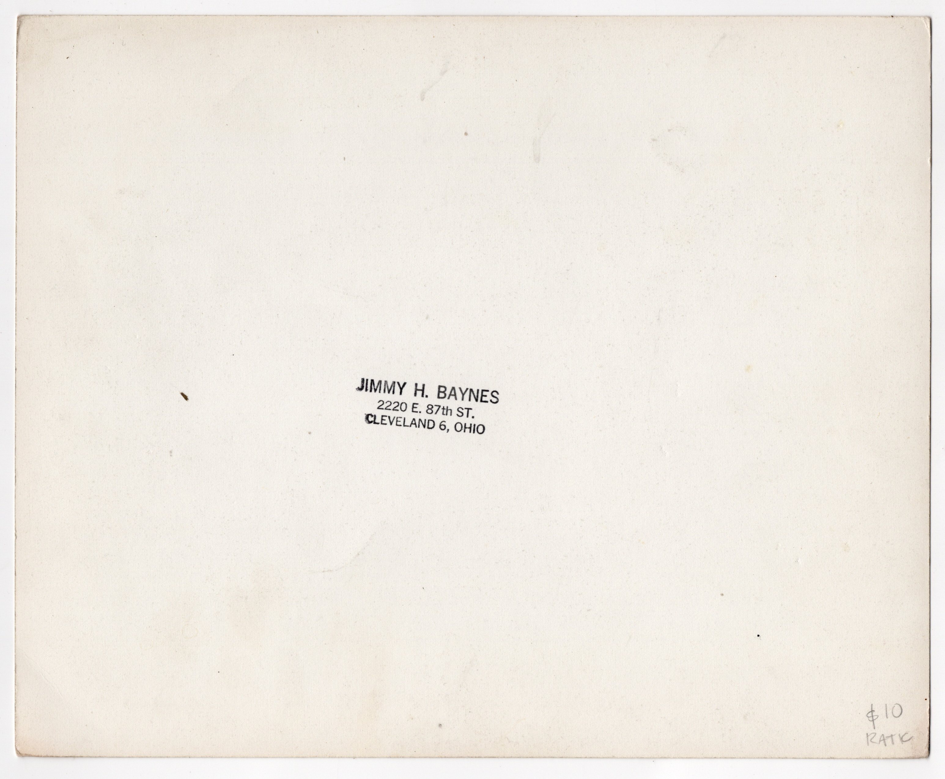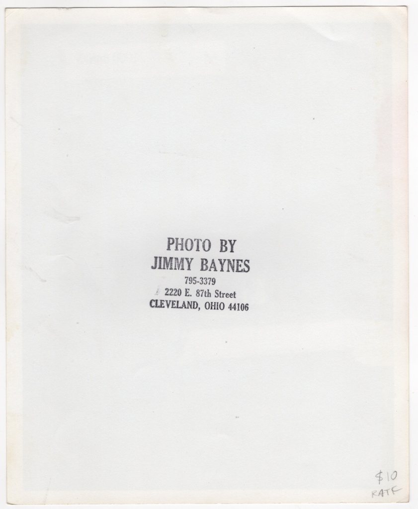 This original black-and-white press photograph was taken by noted Cleveland photographer Jimmy Baynes, whose stamp appears on the reverse. Baynes was a prolific photojournalist and chronicler of Cleveland’s African American community during the mid-20th century. His work documented civic events, political gatherings, cultural programs, and the everyday lives of African Americans in Cleveland. His images today stand as a vital record of local history and are increasingly valued by collectors of press photography and African American ephemera. The photograph depicts a group at the Associated Community Blood Banks booth (Cleveland, Ohio). The booth is labeled “54 Associated Community Blood Banks” on the backdrop. Five individuals are present. One of the individuals is a young woman wearing a white uniform and holding testing equipment. She is likely a  nurse or a blood bank technician. The scene captures both the professionalism and community service focus of Cleveland’s blood bank efforts in the late 1960s or 1970s, with an emphasis on outreach, participation, and health education. The candid but posed composition reflects Baynes’s signature style of highlighting people within civic and cultural spaces. The photographer of this photograph, Jimmy Baynes was  known for his ability to capture the essence of African American life, culture, and entertainment from the 1950s through the 1980s. Originally a postal worker, Baynes pursued photography as a passion, ultimately founding Baynes Foto Service. His work chronicled the vibrancy of mid-century African American social life, from intimate gatherings and beauty contests to the pulsating energy of live music performances and political events. Baynes photographed some of the most iconic figures in entertainment history, including Aretha Franklin, Louis Armstrong, Count Basie, Mahalia Jackson, Louis Jordan, Jerry Lee Lewis, the Platters, and the Drifters. His ability to capture both candid and staged moments gave his work a lasting impact, preserving the rich history of Cleveland’s African American community. His legacy is recognized today by institutions such as the Rock and Roll Hall of Fame and Museum Library and Archives in Cleveland, which houses a collection of his photographs, primarily focusing on music and entertainment. In 2010, shortly before his passing, his work was featured in the “Polaroid: Instant Joy” exhibition in Brooklyn, New York, reaffirming his role as a visual storyteller of African American life in the mid-20th century.  (SOLD)