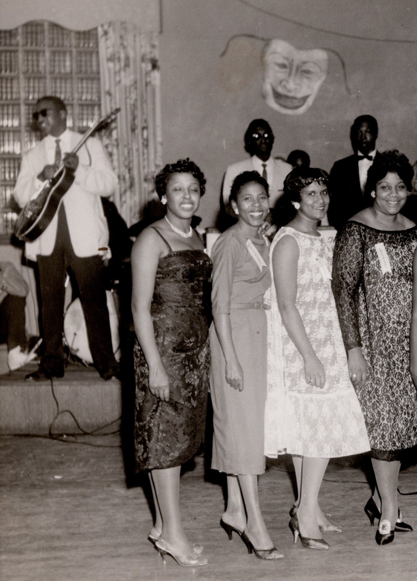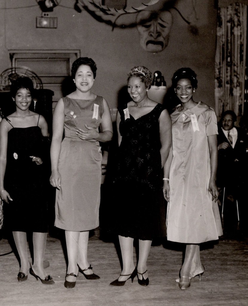 This dynamic vintage press photograph captures a joyous and stylish moment at what appears to be a mid-century African-American social event or pageant, photographed by Jimmy H. Baynes, a notable African-American photographer who was active in Cleveland, Ohio. The image dates likely to the late 1950s or early 1960s, an era when such gatherings were vital community affairs celebrating Black excellence, fashion, and music. The central focus is a beautifully posed group of six African-American women, all elegantly dressed in cocktail or evening wear. The women wear a range of fashionable 1950s attire, from a sharp houndstooth pantsuit and flowing evening gowns to a crisp white suit. Their hairstyles are elegant and era-appropriate, and their expressions range from joy to pride to graceful composure. The setting appears to be a formal banquet hall or community venue, likely in Cleveland. Each woman holds a trophy, suggesting the conclusion of a pageant, award ceremony, or fashion competition. The photograph is the work of Jimmy H. Baynes, a prominent African-American photographer who chronicled the Black social and cultural scene in Cleveland throughout the mid-20th century. His work often captured the heart of the community—beauty pageants, civic events, family milestones, and musical gatherings—preserving an important visual history that is increasingly recognized and appreciated by collectors and scholars.  The photographer of this photograph, Jimmy Baynes was  known for his ability to capture the essence of African American life, culture, and entertainment from the 1950s through the 1980s. Originally a postal worker, Baynes pursued photography as a passion, ultimately founding Baynes Foto Service. His work chronicled the vibrancy of mid-century African American social life, from intimate gatherings and beauty contests to the pulsating energy of live music performances and political events. Baynes photographed some of the most iconic figures in entertainment history, including Aretha Franklin, Louis Armstrong, Count Basie, Mahalia Jackson, Louis Jordan, Jerry Lee Lewis, the Platters, and the Drifters. His ability to capture both candid and staged moments gave his work a lasting impact, preserving the rich history of Cleveland’s African American community. His legacy is recognized today by institutions such as the Rock and Roll Hall of Fame and Museum Library and Archives in Cleveland, which houses a collection of his photographs, primarily focusing on music and entertainment. In 2010, shortly before his passing, his work was featured in the “Polaroid: Instant Joy” exhibition in Brooklyn, New York, reaffirming his role as a visual storyteller of African American life in the mid-20th century. This photograph was taken in the 1950’s.  (SOLD)