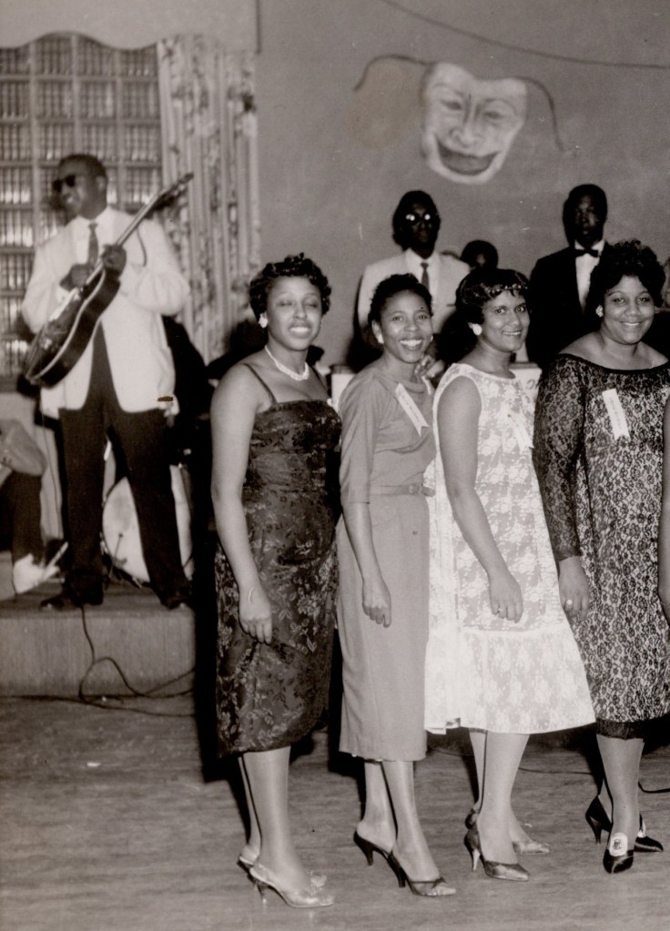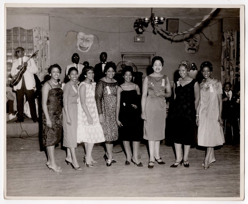 This dynamic vintage press photograph captures a joyous and stylish moment at what appears to be a mid-century African-American social event or pageant, photographed by Jimmy H. Baynes, a notable African-American photographer who was active in Cleveland, Ohio. The image dates likely to the late 1950s or early 1960s, an era when such gatherings were vital community affairs celebrating Black excellence, fashion, and music. The central focus is a beautifully posed group of eight African-American women, all elegantly dressed in cocktail or evening wear. Each woman wears a dress that reflects the fashion of the era—from sleek satin to lace, florals, and polished tailoring. Their heels, jewelry, and stylish hairdos speak to pride and sophistication. Several wear ribbons or corsages, suggesting this might be a pageant, cotillion, or civic recognition event. The women’s expressions range from warm smiles to dignified calm, exuding confidence and unity. In the background, we see a small jazz ensemble, including a guitarist in a white jacket and a saxophonist, adding to the lively, celebratory atmosphere. The wall décor includes two large theatrical masks (tragedy and comedy), enhancing the impression that this event took place at a community center, fraternal hall, or social club with cultural significance. The photograph is the work of Jimmy H. Baynes, a prominent African-American photographer who chronicled the Black social and cultural scene in Cleveland throughout the mid-20th century. His work often captured the heart of the community—beauty pageants, civic events, family milestones, and musical gatherings—preserving an important visual history that is increasingly recognized and appreciated by collectors and scholars. This original black-and-white photograph measures approximately 8 x 10 inches and is in very good condition with only minimal corner wear. The contrast is strong, the image is sharp, and all details are well preserved (see scans). The photographer of this photograph, Jimmy Baynes was  known for his ability to capture the essence of African American life, culture, and entertainment from the 1950s through the 1980s. Originally a postal worker, Baynes pursued photography as a passion, ultimately founding Baynes Foto Service. His work chronicled the vibrancy of mid-century African American social life, from intimate gatherings and beauty contests to the pulsating energy of live music performances and political events. Baynes photographed some of the most iconic figures in entertainment history, including Aretha Franklin, Louis Armstrong, Count Basie, Mahalia Jackson, Louis Jordan, Jerry Lee Lewis, the Platters, and the Drifters. His ability to capture both candid and staged moments gave his work a lasting impact, preserving the rich history of Cleveland’s African American community. His legacy is recognized today by institutions such as the Rock and Roll Hall of Fame and Museum Library and Archives in Cleveland, which houses a collection of his photographs, primarily focusing on music and entertainment. In 2010, shortly before his passing, his work was featured in the “Polaroid: Instant Joy” exhibition in Brooklyn, New York, reaffirming his role as a visual storyteller of African American life in the mid-20th century. This photograph was taken in the 1950’s.  SOLD