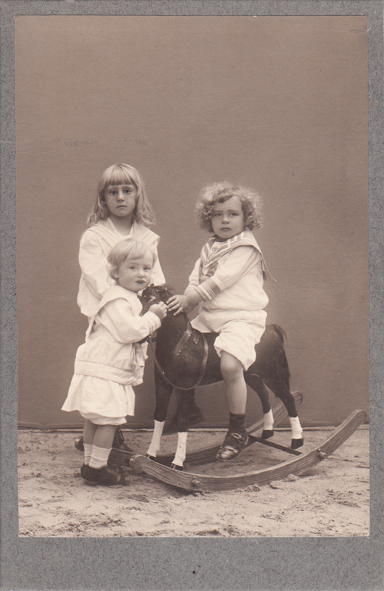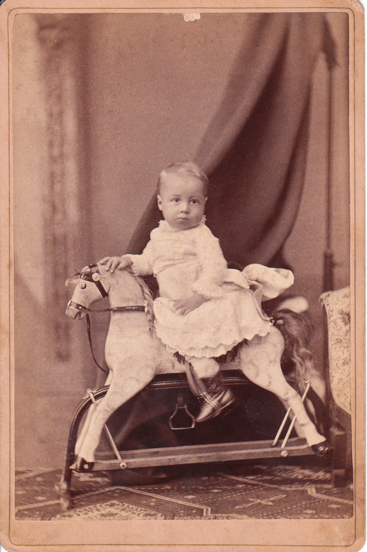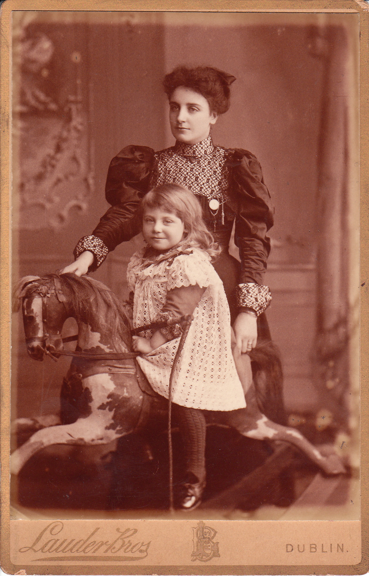 A cute little girl with a wonderful smile sits atop a rocking horse at Lauder Brothers studio in Dublin, Ireland. She is holding the reins of the very detailed rocking horse and her young mother poses behind the girl, in position to keep her daughter securely on the horse. The Lauder gallery had two locations, 32 Westmoreland Street and 45 Lower Sackville Street. Lauder Brothers studio began operation as a daguerreotype studio on Capel Street in Dublin in 1853. The owner of the studio was Edmund Stanley Lauder, who died in 1895. Lauder Brothers was in business on Lower Sackville Street between the 1850’s and 1904. It was operated by a number of members of the Lauder family. Business directories list the studio as Lauder Brothers between about 1880 and 1884.. Edmund Lauder’s son, James Stack Lauder (1853-1923), founded the Lafayette Studio in 1880. He became the first Irish photographer to be granted the Royal Warrant. He earned this honor after photographing Queen Victoria in her Golden Jubilee year (1887). James Stack Lauder had three brothers who also became photographers. The brothers names were George Marsh Lauder (1858-1922), Edmund Stanley Lauder Jr. (1859-1895), and William Harding Lauder (1866-1918). (SOLD)