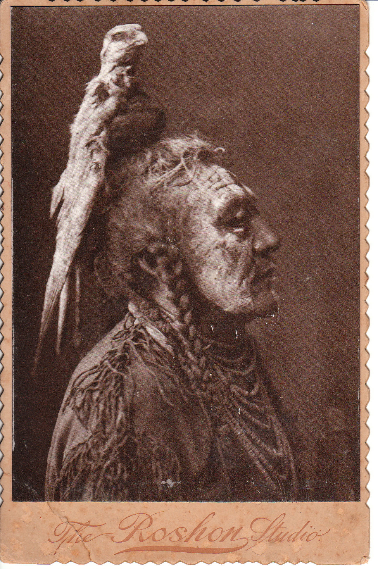 This cabinet card is a terrific image of a Native American dressed in his tribal clothing. He has a bird on his head that looks as weathered as he does. The bird may be a turkey vulture. Hopefully, a visitor to this site with some ornithology knowledge, can better identify or confirm the bird’s species. What an amazing photograph? However, is it a counterfeit cabinet card? I located the cabinet card in an antique store and purchased it with a great deal of reluctance. Native American cabinet cards have a history of being a popular type of cabinet card to counterfeit, due to their potential high value and strong demand. There are a number of methods to make fake images. This photograph does not seem to be a product of a high tech copy machine. However, the image could be a Native American postcard pasted over an “ordinary” cabinet card image. This cabinet card, if not the image, is from the studio of C. S. Roshon of Lebanon, Pennsylvania. The photograph was produced in 1892. Perhaps a traveling western show was in the area of Lebanon; or perhaps Roshon purchased this image to sell at his galleries. The Roshon Galleries were located at 142 North 8th Street, and 22 South 9th street, in Lebanon. Roshon also had a studio somewhere in New Jersey. Any comments from Cabinet Card Gallery visitors, regarding the authenticity of this cabinet card, would be greatly appreciated. To view other photographs from Roshon’s studio, click on the category “Photographer: Roshon”.