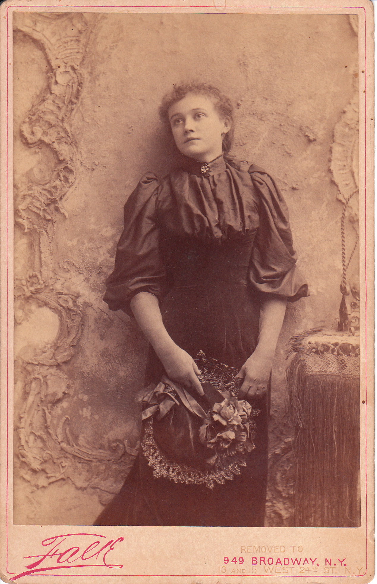 Photograph 1 is a cabinet card portrait of Minnie Dupree (1873-1943). She was an American stage and film actress. She was born in La Crosse, Wisconsin. She made her acting debut in a touring company in 1887. In 1888, she was a sensation in a small role in William Gillette’s New York play. “Held by the Enemy”. This role propelled her into a number of supporting roles with the some of the leading actors of the day. She finally got a starring role in the 1900 production of “Women and Wine”. Many other leading roles followed as well as a number of notable successes. However, critics agreed that her later career was less successful than her early and middle career. Dupree also made a small number of films including “The Young in Heart” (1938). Costars in this film included Janet Gaynor, Douglas Fairbanks Jr., Billie Burke, and Paulette Goddard. This cabinet card photograph captures Miss Dupree holding her had and looking dreamily away from the camera. The photograph was taken by celebrity photographer, B. J. Falk. Falk’s address is listed as 949 Broadway, New York City. However, there is a light stamp over the Broadway address indicating that the studio had “removed” to 13 & 15 West 34th Street, New York City. To see other photographs by Falk, click on the category “Photographer: Falk”.