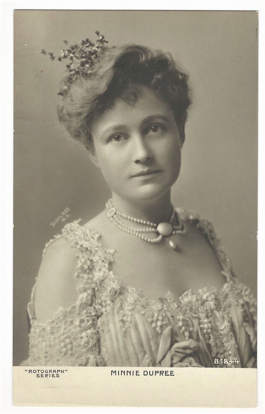 Photograph 2 is a vintage real photo postcard featuring Miss Dupree. The image provides a wonderful close-up view of the actress. She is wearing a fancy dress that is low-cut. Note her pearl necklace. Her hair is styled perfectly, providing a very fresh and clean look. The photographer credited with this fine portrait is celebrity photographer, Jacob Schloss (1856-1938). His studio was located in New York City (Manhattan). He received his education at the Cooper Union in New York City. He graduated in 1872 as an etcher. He joined Benjamin J. Falk’s photography studio and worked there in the mid 1870’s. He left Falk’s employ to open his own studio (54 West 23rd Street) where like Falk, he specialized in theatrical photography. He tended to favor photographing actresses in costume in front of generic studio furnishings. He produced many cabinet card photographs but also was active in the production of magazine images. By the 1890’s he was particularly known for his photographs of beautiful women, much like photographer Jose Maria Mora. Schloss also was an activist for photographers rights. He was very involved in the movement to copyright images. He sued those who used his photographs without crediting or paying him. He was an active participant in national photographer associations and was an worked as a photographer until the 1910’s. The photograph was published by the Rotograph Company as part of the “Rotograph Series” (no.B1844). The postcard has a stamp stating “From Robert S. Simmons”, whom I believe, but can not confirm, was a well known collector of photographs. (SOLD)