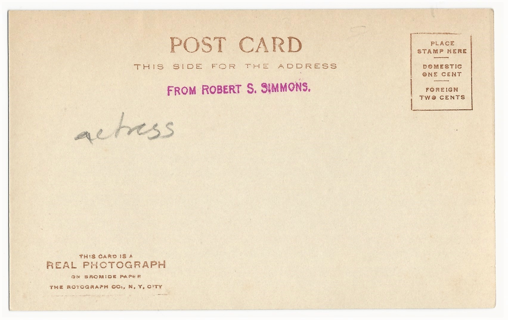 Mrs. Fiske’s photograph on Postcard 1 was taken by William Morrison of Chicago, Illinois. The card was published by Rotograph as part of a series (no.B 627). (SOLD)