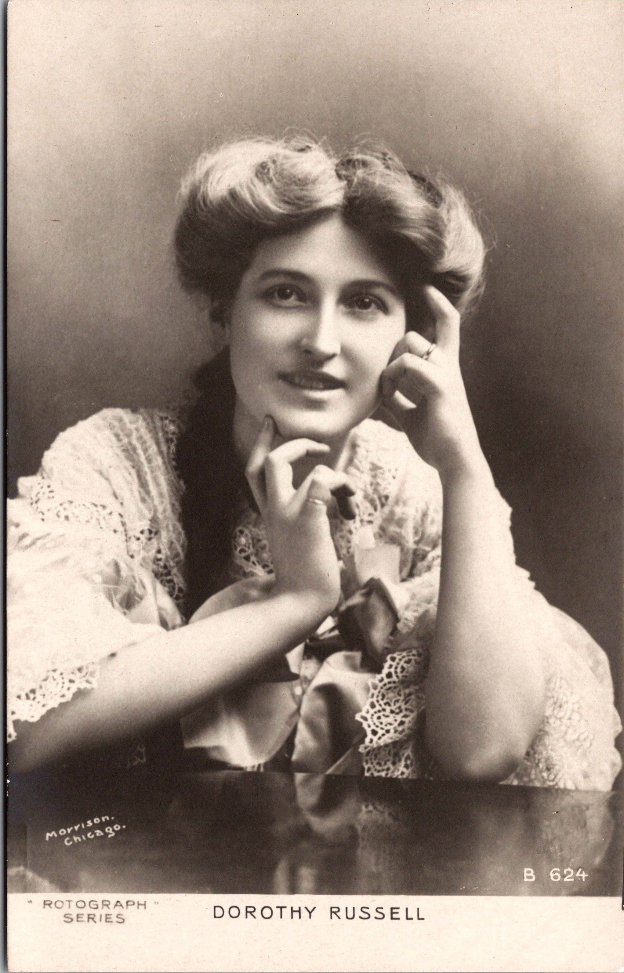 This vintage real photo postcard features actress Dorothy Russell (1883-1954). She was the notorious daughter of the ultimate diva, Lillian Russell (1860-1922). Dorothy was in three Broadway plays between 1904 and 1907. Dorothy’s trademark was her penchant for sensational hijinks, divorces, and legal fights. Dorothy was married seven times. In one civil suit, she was forced to surrender jewelry given to her mother by “Diamond Jim” Brady. The court insisted that she use the proceeds from the jewelry to pay off personal debts. A stamp on the reverse of the postcard indicates that this card was once the property of Robert S. Simmons. This postcard was published by the Rotograph Company (New York City). It is part of the Rotograph Series (No. B 624), The photographer of this image is William Mckenzie Morrison whose studio was located in the Haymarket Theatre building in Chicago, Illinois. Morrison was a well known and successful celebrity photographer. (SOLD)