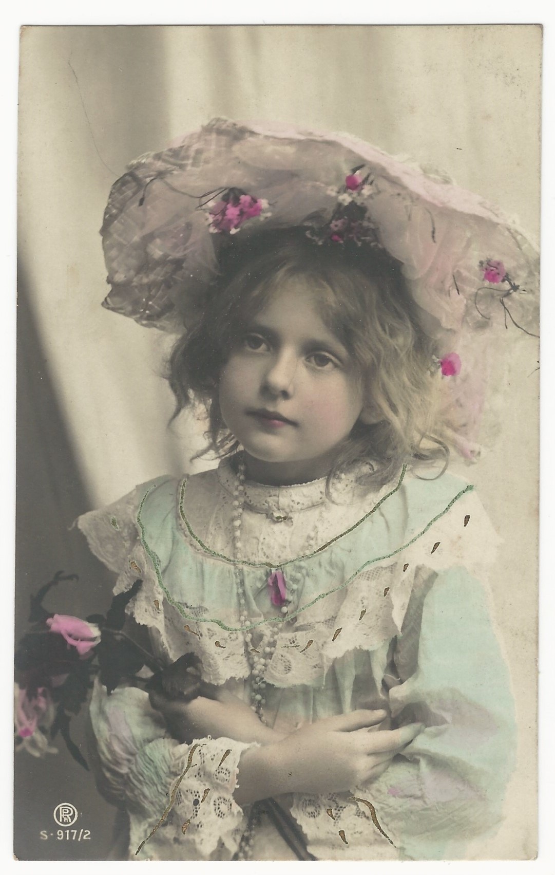 This vintage real photo postcard features a beautiful young girl wearing a frilly dress and adorned with flowers. The postcard was published by Rotophot (RPH) as part of a series (S-917/2). The company was based in Berlin, Germany. In the message section, the writer wishes the reader “good health”. The hand tinted color postcard was mailed with a French stamp. SOLD
