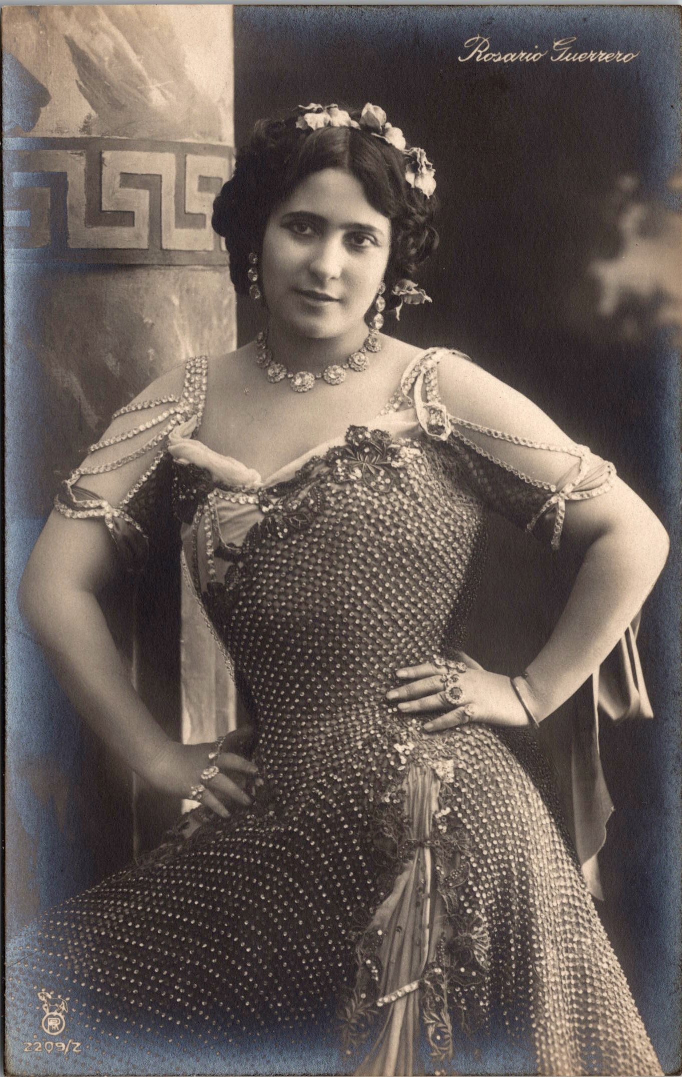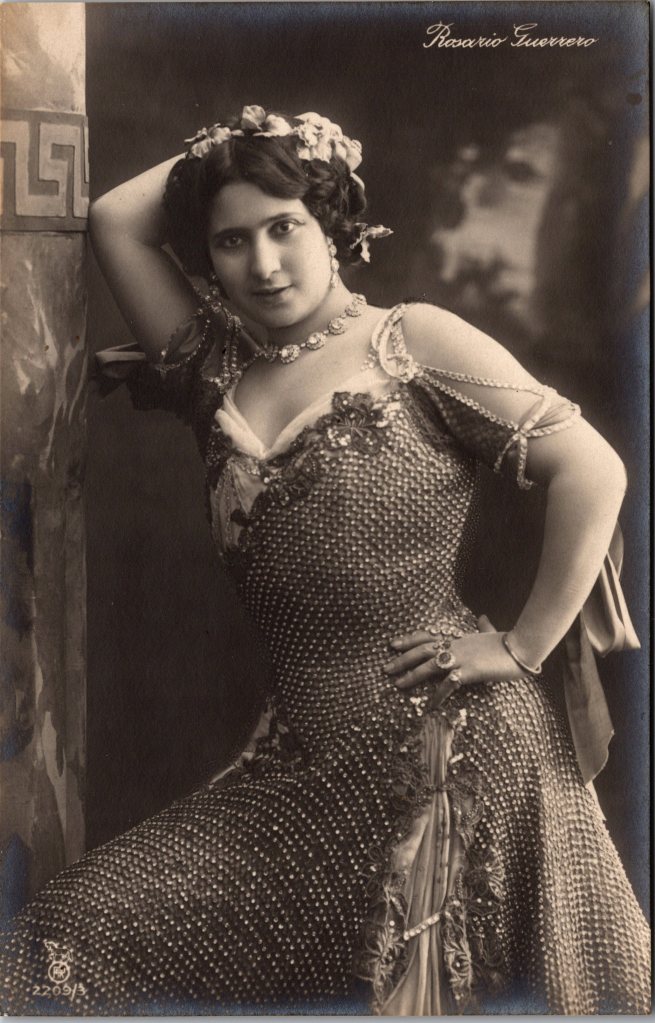 This lovely vintage real photo postcard (Postcard 1)features Spanish dancer and pantomimist, Rosario Guerrero (1880-1960). She was an international star who is most associated with the role of “Carmen”. She was not a singer. Instead, she performed in the ballet version of the opera. This performance occurred in 1903 at the Alhambra Theatre in London. In 1903 and 1904, she performed in New York. She had been brought to New York City by Florenz Ziegfeld. In 1905 she returned to the stage in London. It was reported that she had a breakdown from “excessive dancing” and was hospitalized in Vienna, Austria (1906). After that episode, she performed in US cities including New York, Chicago, San Francisco, and Indianapolis. She owned an estate in France. Guerrero was noted to be quite beautiful. She modelled for well known artists of the day. Her sister, Enriqueta was also a dancer, and she performed in London in the 1900’s. When compared to Spanish dancer, Otero, Guerrero is considered a purer Spanish dancer. Otero’s spanish dancing was alongside her exotic dances. Otero’s fame also came from being a courtesan. However, Guerrero is said to have had an affair with King Leopold of Belgium. One article reports that he gave her over a million dollars worth of jewels. It is interesting to note that King Leopold also had a dalliance with Otero. A brief biographical article reports that Guerrero’s dancing career appears to have ended in 1912. This postcard was published by Rotophot (RPH) as part of a series (2209/3). The company was based in Berlin, Germany. (SOLD)