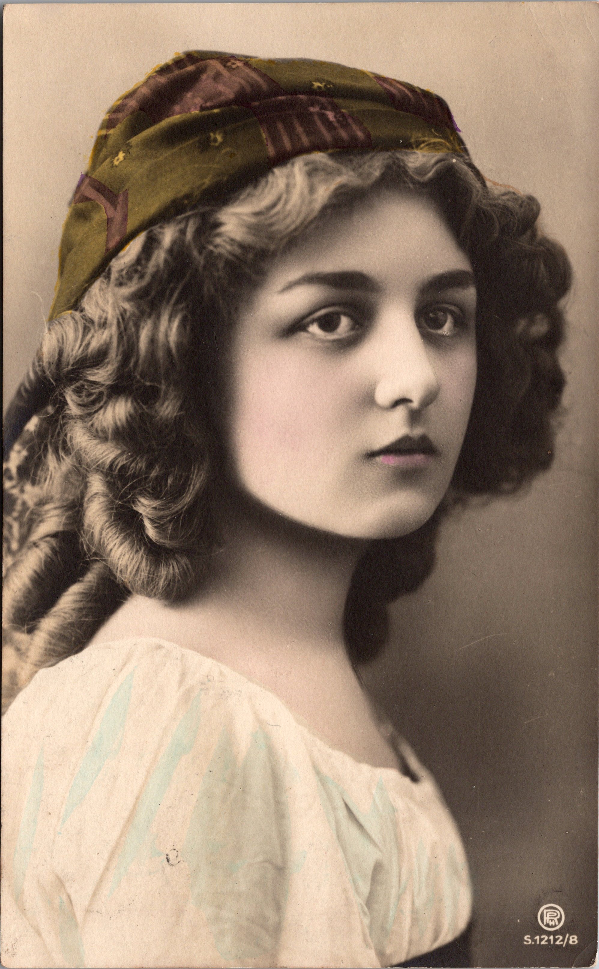 This vintage real photo postcard features a pretty teenage girl with lovely curls. Note her lovely prominent eyes. She is wearing a nice color tinted hat. This postcard was published by Rotophot as part of a series (No.5.1212/8). This card has a German stamp that was postmarked in 1907. The postcard is in good condition (see scans).