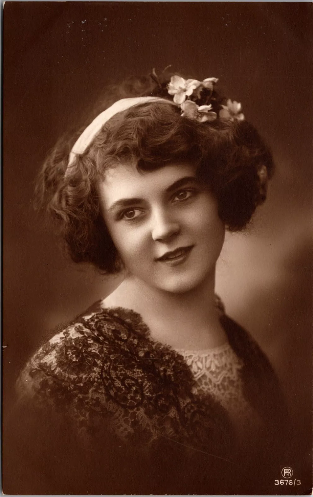 This vintage postcard features a pretty young woman wearing wearing a hair band and flowers in her hair. Note the fantastic detail of the flowers. The dark haired postcard model has a wonderful smile. This postcard was published by Rotophot as part of a series (No.3676/3). The publishing company was based in Germany but had affiliates around the world. The postcard has minor corner wear and edgewear is evident on it’s left border. Overall, the postcard is in good condition (see scans).