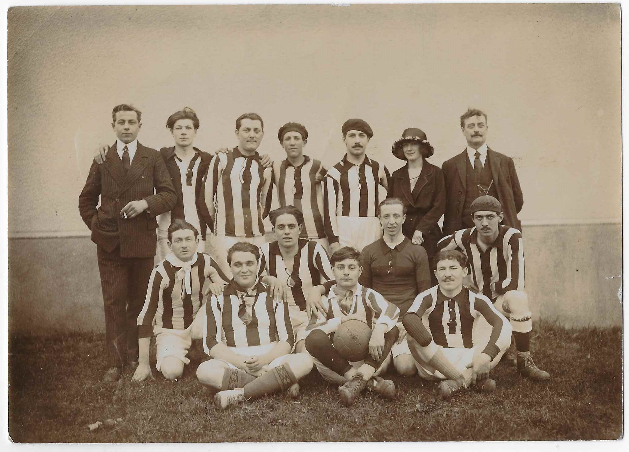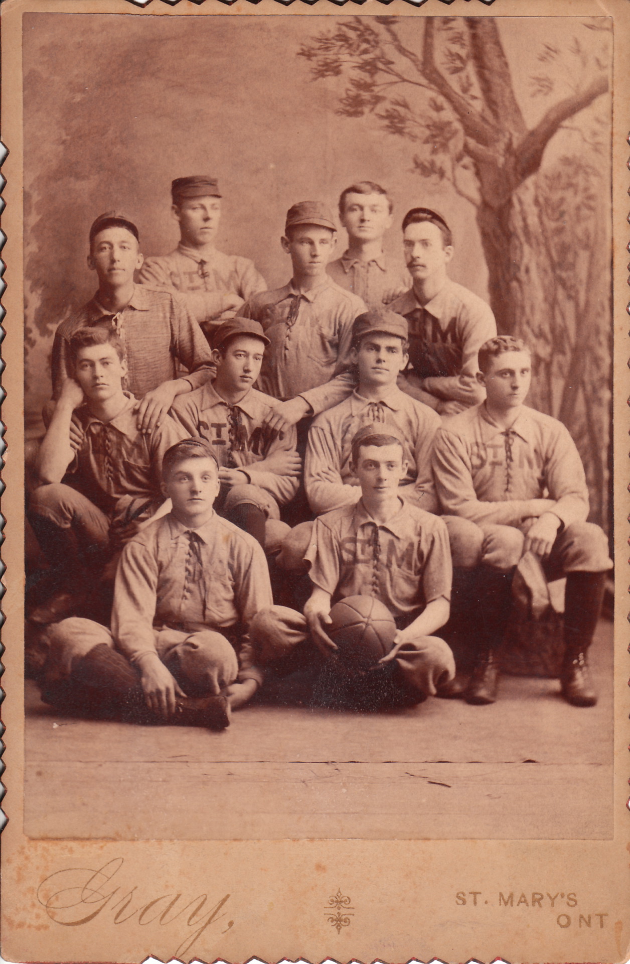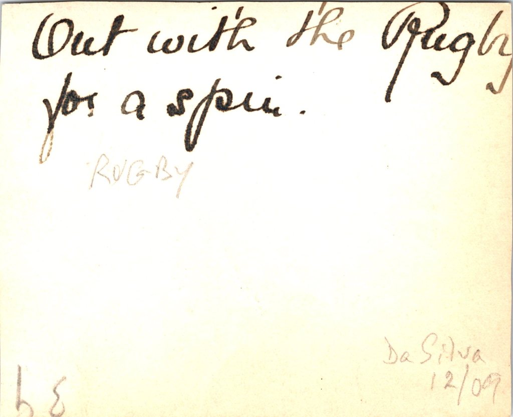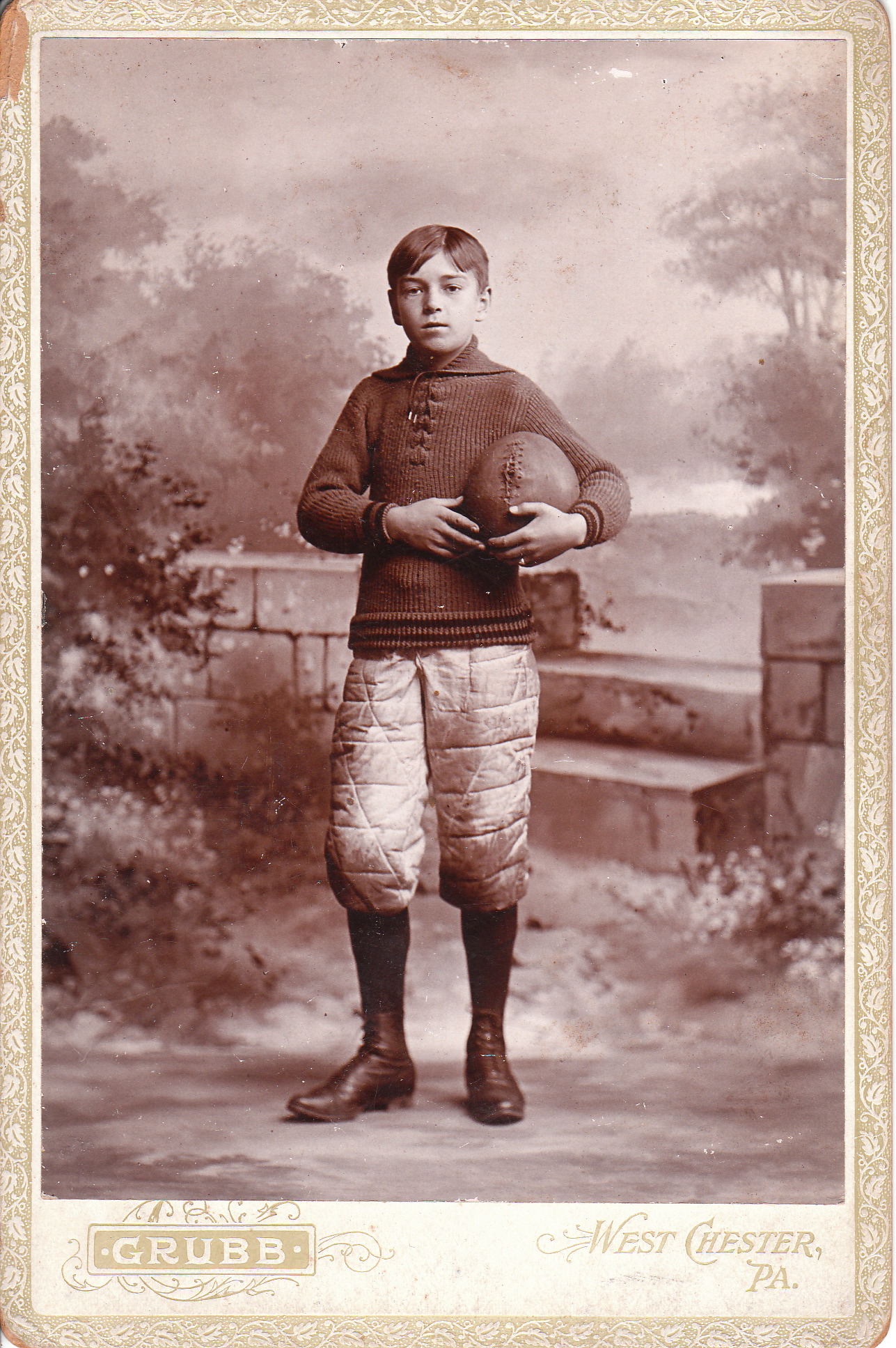 This Cabinet card is a great image of a rugby player in uniform and holding the rugby ball. He looks able and ready to walk on to the pitch and join the scrum. The photographic studio is the famed Pach Bros of New York City. To view other photographs by this studio, click on the category “Photographer: Pach Bros.”.