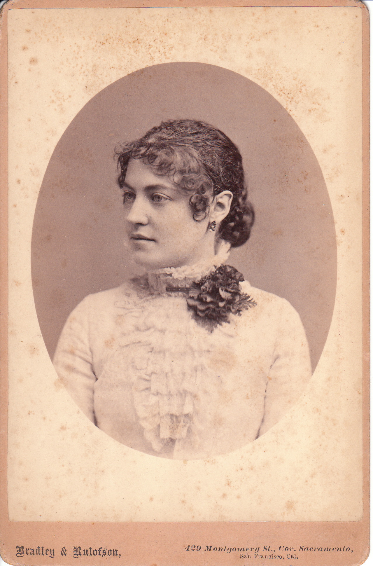 This cabinet card photograph features a pretty young actress. At least, this is likely a stage beauty rather than a “civilian”. This photo was taken by the San Francisco gallery belonging to well respected photographers “Bradley & Rulofson. Their studio took many photographs of stage actresses when they came to San Francisco. Henry William Bradley (1813-1891) and his partner William Rulofson (1826-1876) were partners in a photographic studio that photographed many notable Californians. Bradley was born in Wilmington, North Carolina, and grew up in New Orleans, Louisiana. He opened his San Francisco studio in 1850 and took in his partner in 1860. When he retired in 1878 his studio was considered the best on the west coast and won first prize at the Centennial Exposition at Philadelphia in 1876. Mr Rulofson had quite a controversial and interesting life and associated with many famous people including Ambrose Bierce. Rulofson died in a fall from the roof of his studio and was heard to say during the descent, “I am killed”. (SOLD)