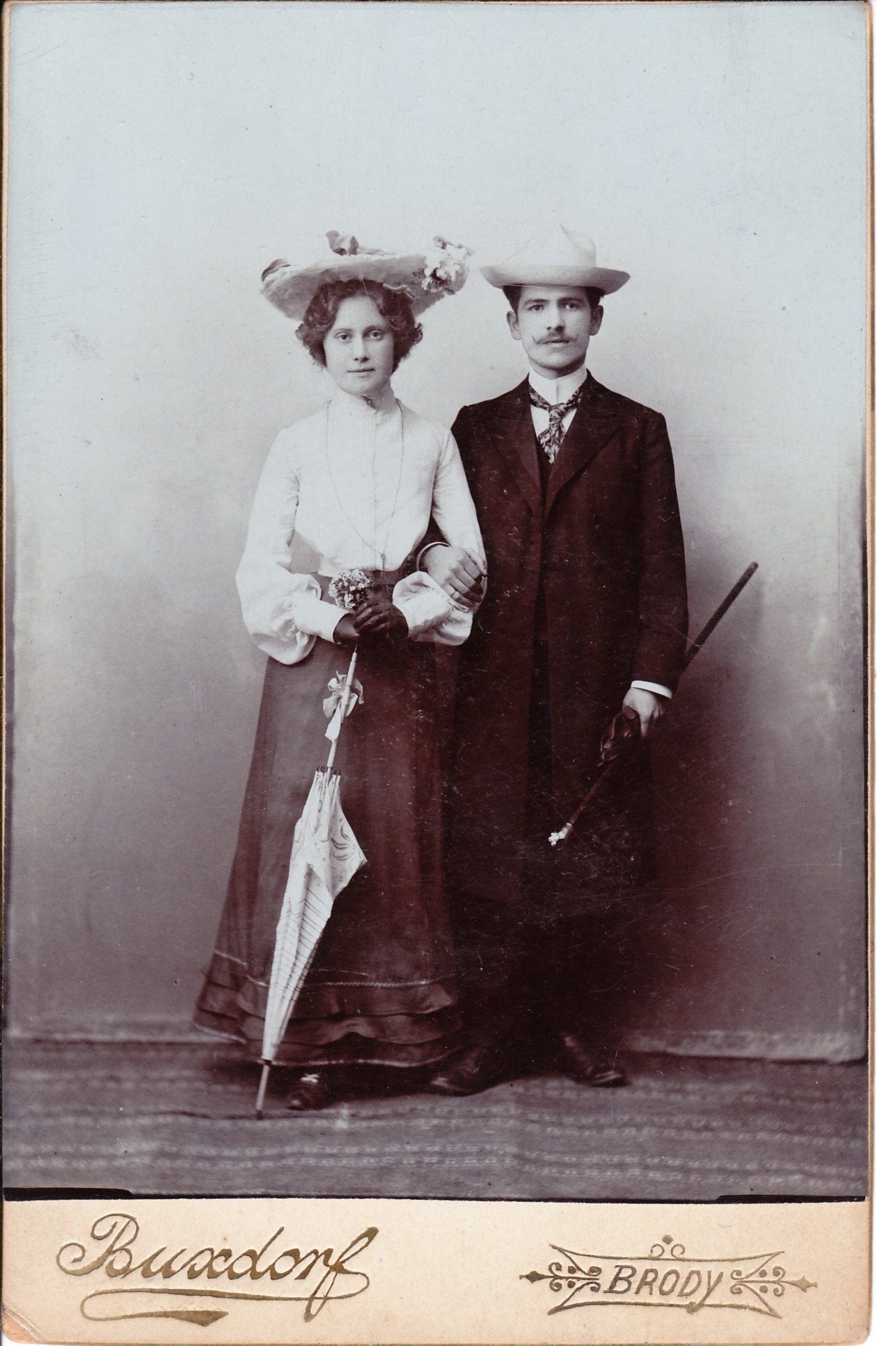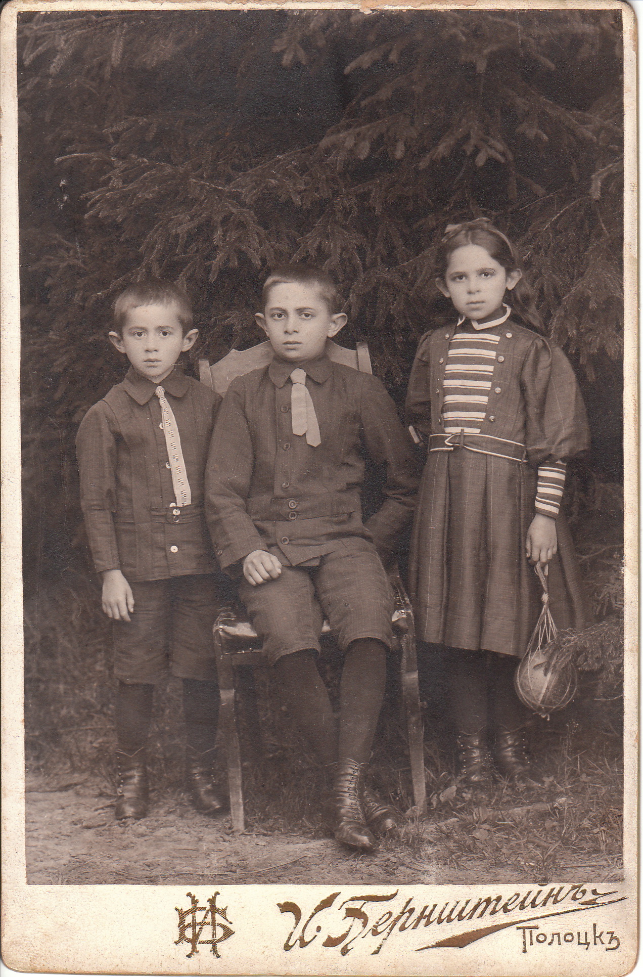 This Cabinet card comes from the estate of a Jewish family. The photograph is an image of a Jewish family in Minsk, Russia. The parents and children are dressed up nicely for their visit to the photographers studio. Note the footwear and the young boy’s hat.