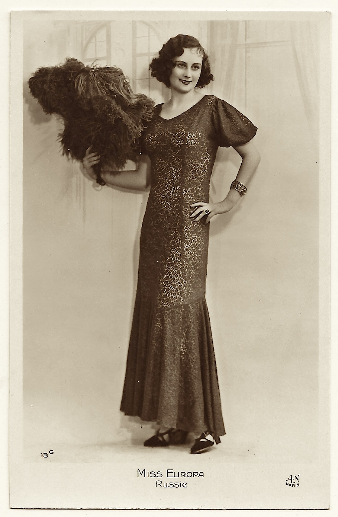 This vintage real photo postcard features Miss Tatyana Maslova photographed while she was participating in the 1933 Miss Europe Contest. She was representing Russia. Her entry into the Miss Russia pageant was in a roundabout way. A journalist from Vilnius, Tayana’s hometown, had entered her in the contest. Along with her photo, the reporter wrote a message stating that Tatyana was the “daughter of a Black Sea Fleet officer who was shot during the Civil War in the south of Russia”. The writer also added that Tatyana was nineteen years of age, fluent in five languages, and “represents the image of the classical Russian beauty”. After winning the Miss Russia title, she went on to the Miss Europe contest in Madrid, Spain, where she was crowned Miss Europe. Tatyana won a trip to Portugal for her victory. She participated in a film in Warsaw and than returned to Vilna where she lived a modest life. Not much is known about her life after winning the Miss Europe contest; though the consensus is that she died at an early age. This postcard was published by well known and acclaimed photographer, Alfred Noyer. His Paris studio operated between 1910 and the 1940’s. Many of the postcards he produced featured nudes or risque images. This postcard was part of the Miss Europa series (no. 13G). (SOLD)