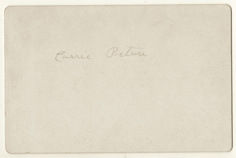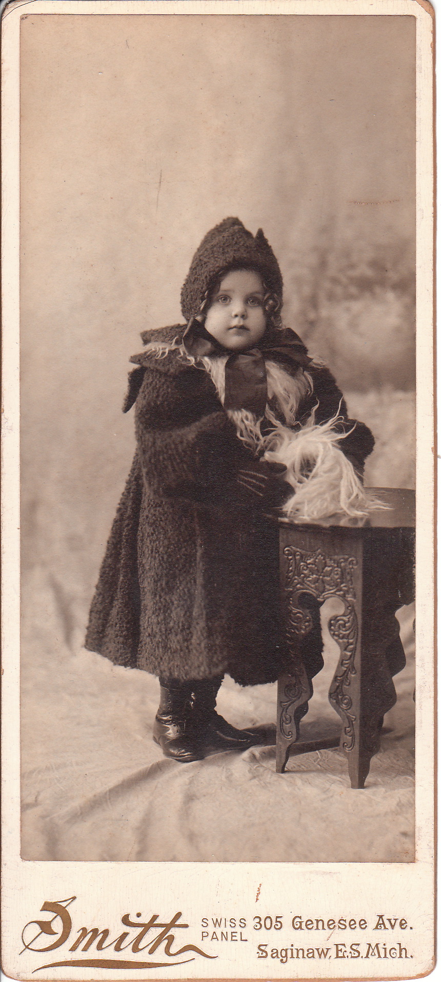 This cabinet card portrait is both interesting and sad. The photograph shows a family of five in mourning. They are dressed in dark clothing and on the table that they are sitting or standing by, is a cabinet card post-mortem photograph of a baby. On the reverse of this cabinet card is the inscription “Carrie Picture”. Clearly, someone has identified the baby as being named “Carrie”. This photograph was taken at the Bannister studio in St. Johns, Michigan. The Michigan Directory of Photographers reports that he operated his St Johns studio in 1895. The directory provides no first name for Mr. Bannister. It is my hypothesis that the photographer of the cabinet card portrait was Frank T. Bannister. He is listed as a photographer in the 1885 business directory for Saginaw, Michigan. He also appears in the 1910 US census as a photographer residing in New Richmond, Wisconsin.