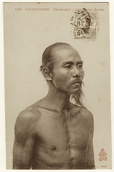 This vintage postcard features a shirtless Vietnamese man. The man is from the region of Cochinchina which is comprised of the southern third of current Vietnam. The region’s principal city is Saigon. The area was a French colony from 1862 through 1954. In 1954, South Vietnam was created by combining Cochinchina with southern Annam. Printed near the top of the postcard is the word “Thu Dau Mot” which is the capital city of Binh Duong Province in Vietnam. The city is just 20 km from downtown Saigon (Ho Chi Minh City). The photographer of this image was Pierre Dieulefils. He was the first established professional photographer in Hanoi. He worked in Indo-China from around 1900 to 1910. In addition, he was a postcard editor and explorer. He had an excellent reputation as a photographer throughout Europe and Indochina. He won many medals at Universal Exhibitions. It is estimated that he produced approximately five thousand photos and postcards and he is considered one of the greatest photographers of the region. His photographic expeditions included such locales as Vietnam, China, and Cambodia. His photographs are considered “the very best visual records of the life, people, customs, and native peoples” of North and South Vietnam. This postcard is part of a series (no.1471), The postcard was published between 1900 and 1910.   SOLD