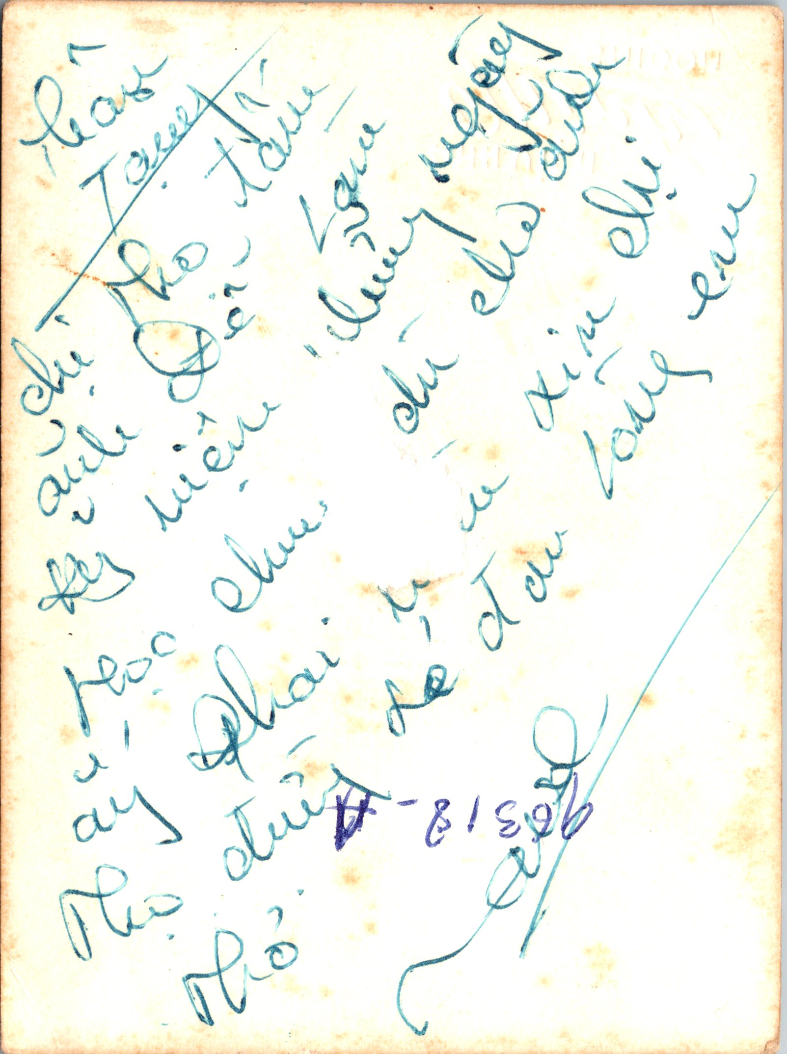This vintage photograph features a pretty young Vietnamese woman wearing boxing gloves and in a boxing stance. This young woman may actually be in her teenage years. I wonder is she is really a boxer or if she was just posing as one. There is an inscription on the reverse of the photograph. I believe the notation is written in French. There is a stamp imprinted on the card revealing that the image was taken at the Minj studio in Saigon. (SOLD)