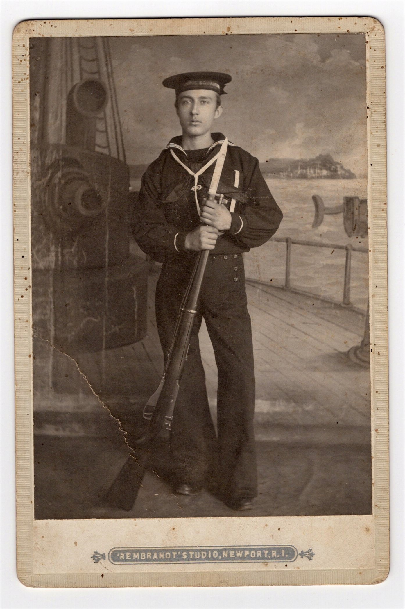 A nice looking young sailor poses for his portrait at the Rembrandt Studio in Newport, Rhode Island. Newport is a seaport and the sailor was likely in town on leave. While visiting the area he decided to capture his likeness at the studio. Perhaps he sent the resulting photograph to his family or girlfriend. He, or the photographer, chose an appropriate background for the portrait. The sailor is depicted aboard a ship, in uniform, and holding a rifle with a bayonet. The lettering on his sailor cap can only be partially read. The word “squadron” is proceeded by an unknown word which probably is the name of an area of the world where his ship was assigned. Perhaps a visitor to the cabinet card gallery can identify the sailors naval unit and rank. Research yielded no information pertaining to the Rembrandt Studio. SOLD
