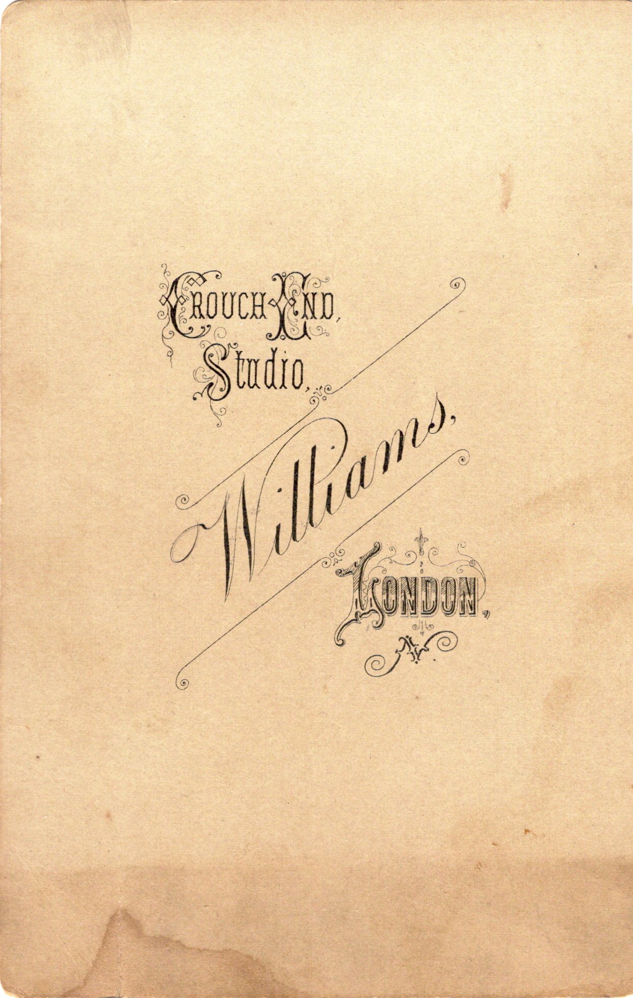 A pretty young woman wearing a sailor dress poses with a boat oar, rope, and life preserver at the Williams studio in Crouch End, England. Hopefully, she didn’t get her hair wet because her hair is so long that it might take decades to dry. This nautical minded subject appears to be standing on the steps outside a building, though it is possible that she is actually inside a studio in front of a terrific backdrop. Crouch End is five miles outside of London. SOLD