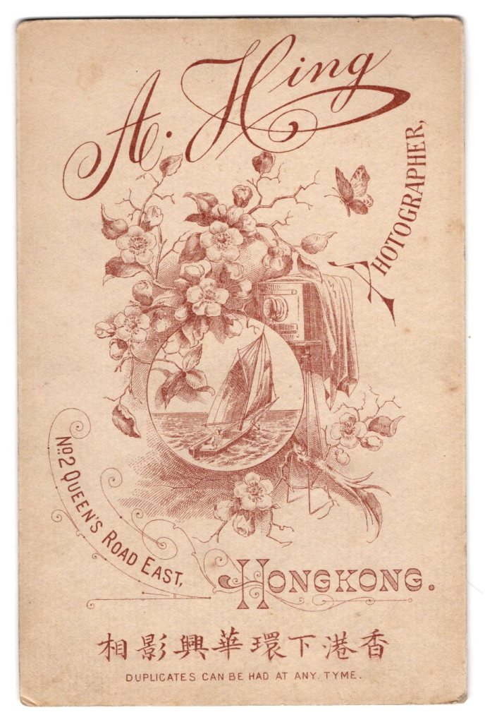 This cabinet card is a memorial photograph of J. W. Stubbs who was accidentally killed in Hong Kong. Stubbs was a stoker (tended to the engine) aboard the H.M.S. Astraea. He died in 1912 and this cabinet card was made by his shipmates in his memory. The image of this smiling and handsome 20 year-old sailor, who died tragically, evokes much sadness. The Astraea was a cruiser of the Royal Navy. She was commissioned for service in 1895 and was active in World War I. She was scrapped in 1920. The photographer who made this memorial card was A. Hing of Hong Kong. (SOLD)