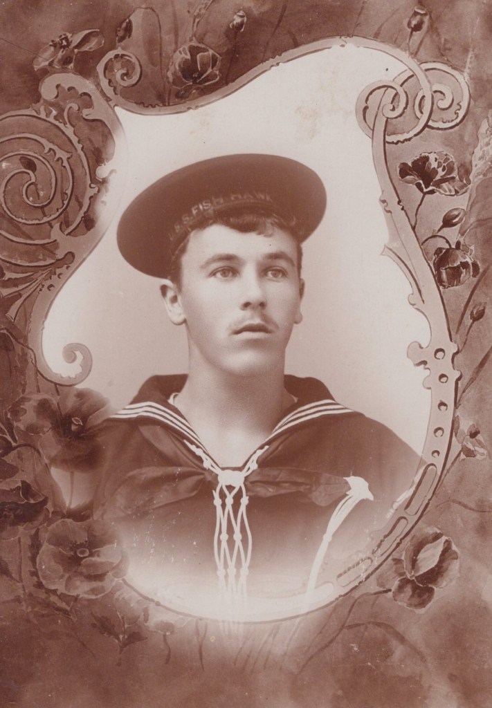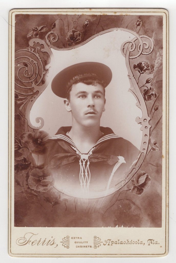 This cabinet card portrait features a young and handsome naval sailor in uniform. His cap reveals that he was part of the crew of the USS Fish Hawk. The ship was launched in 1879. Originally, called the USFC Fish Hawk, the ship was a fisheries science research ship. It conducted research and ran a large fish hatchery on board. The ship was operated by the United States Commission of Fish and Fisheries. The Fish Hawk was the first large ship built by any country for the purpose of promoting fisheries. The ship operated during it’s 46 year career along the US eastern coast and in the Gulf of Mexico. However, the ship also served in the US Navy in 1898 during the Spanish-American War and from 1918 to 1919. The sailor seen in this cabinet card portrait was serving on the ship during the Spanish-American War. The sailor had his photograph taken a the Ferris studio in Apalachicola, Florida. The city of Apalachicola is located on the shore of Apalachicola Bay, an inlet of the Gulf of Mexico. The city was captured by the Union navy early in the Civil War. Before the late 19th century, Apalachicola was the third busiest port on the Gulf of Mexico. It was only behind New Orleans and Mobile. This cabinet card portrait is an interesting remnant of American naval history. SOLD