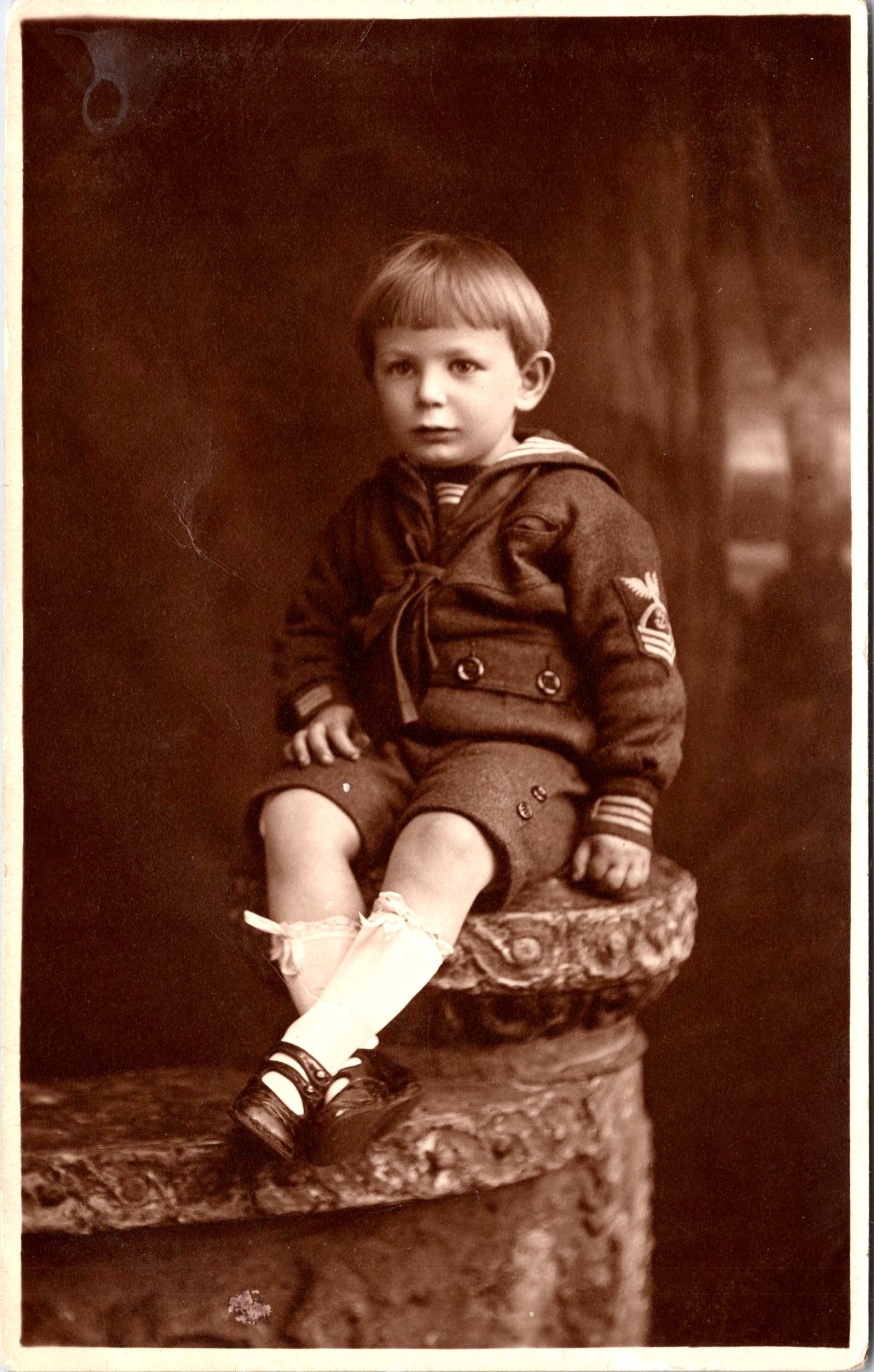 This photograph captures a young boy dressed in a formal sailor suit. The outfit is unusual, as most children wearing nautical clothing in photographs of this era are not clad in such a fine suit. The photographer is Taylor of Wilmington, North Carolina. Wilmington is a US naval port and it is very possible that this boys father was a high ranking naval officer stationed there. One can surmise that he was an officer because a child dressed in such finery must come from a well-to-do family. (SOLD)