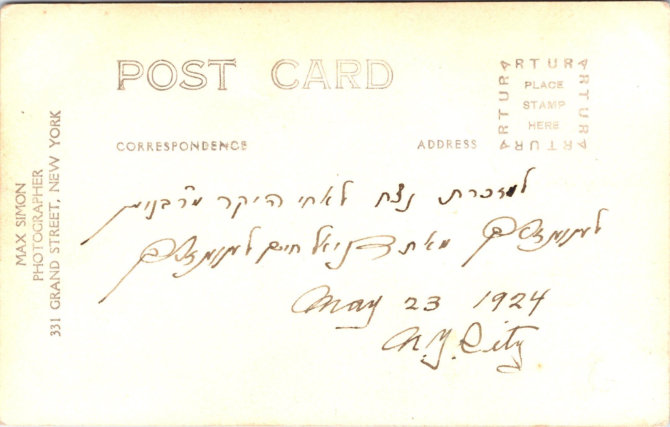 This vintage divided back real photo postcard features an adorable little boy. He is wearing a sailor outfit. Note his socks. There is a bow at the top of each sock. Also note the message on the reverse of the postcard is written in Hebrew. The card is dated 1924. The photographer of this child’s portrait is Max Simon. Simon was extremely likely, a Jewish man. He operated a studio at 331 Grand Street in New York City. (SOLD)