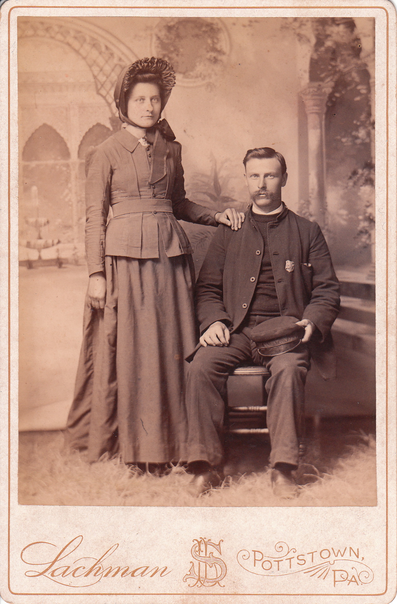 This cabinet card photograph features a couple dressed in Salvation Army Uniforms. They are likely a married couple considering the familiarity evident by the woman resting her hand on the mans shoulder. The man is holding his hat on his knee and is wearing a Salvation Army Badge. The photograph was taken at Lachman’s Studio in Pottstown, Pennsylvania. A photographic journal (1894) cites a studio called Isaac S. Lachman & Son located in Pottstown. Anthony’s Photographic Bulletin (1901) reports the “recent death” of Isaac Lachman.