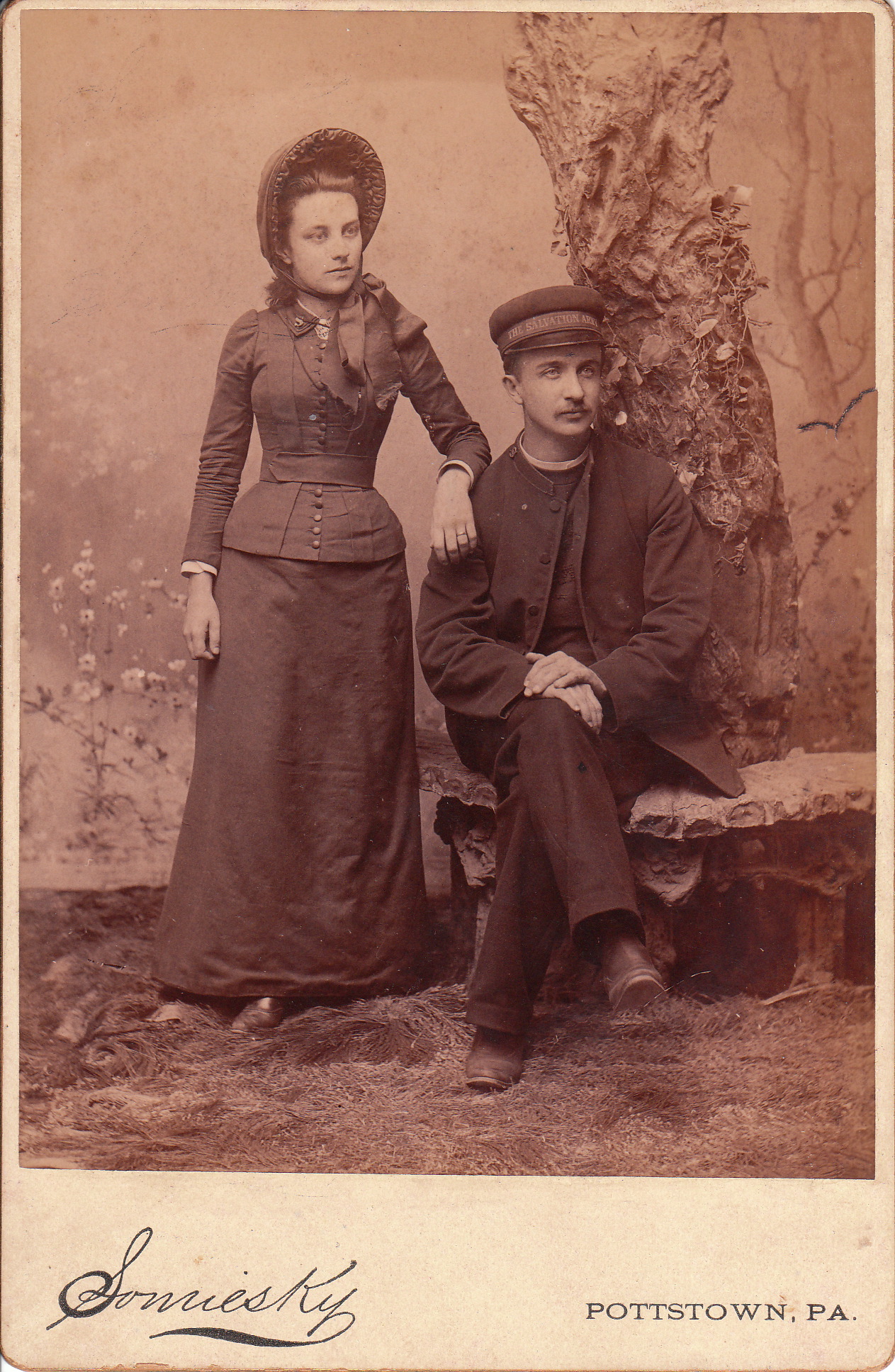 This cabinet card is a portrait of a young couple in their Salvation Army uniforms. The woman is wearing a pin on her collar, and the man is wearing a hat that identifies them as Salvation Army members. There is a great deal of familiarity between the couple which is illustrated by the woman resting her hand and part of her arm on the man’s shoulder. The photographer, Somiesky, was located in Pottstown, Pennsylvania. To see other photographs of Salvation Army members, click on Cabinet Card Gallery’s category of “Salvation Army”.