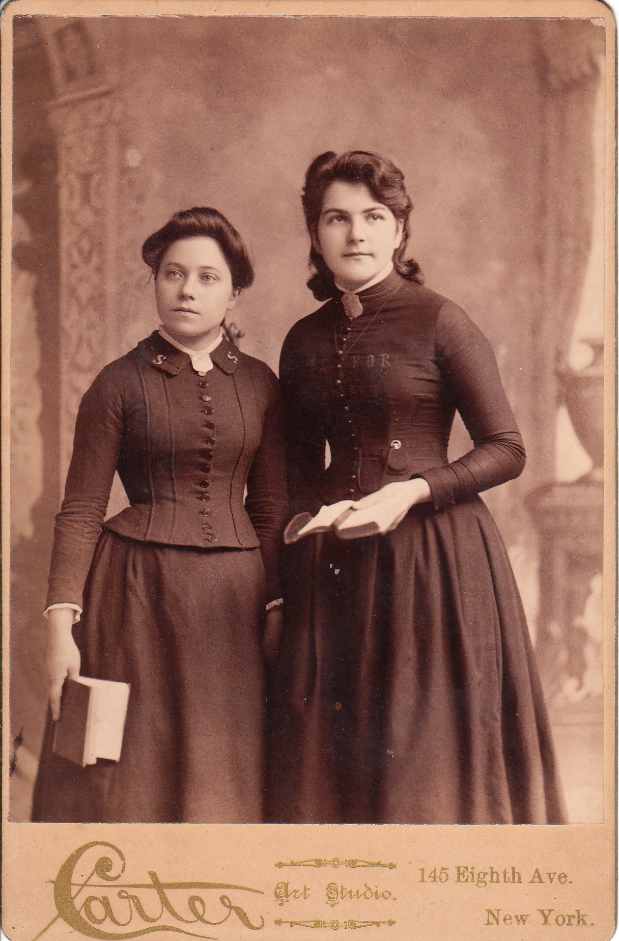 Two young women in Salvation Army uniforms, pose for their portrait at the Carter Art Studio, in New York City, New York. Note that one woman is wearing Salvation Army pins on both collars and that both women are wearing Salvation Army badges at their collar. The woman appear to be in their twenties, and one wonders what motivated them to join the Salvation Army. Did they have religious convictions that drew them to the organization? Were they hoping to help people or change the world in a positive way? Did they see joining the Salvation Army as a way to be able to live in exciting New York City. Unfortunately, the answers to these questions are lost to history. To see a collection of images of other Salvation Army workers;click on the Cabinet Card Gallery’s category “Salvation Army”.