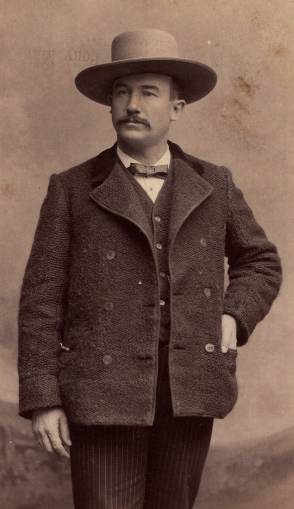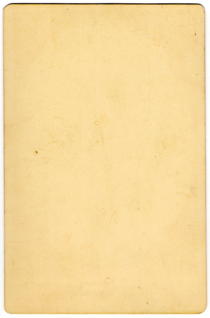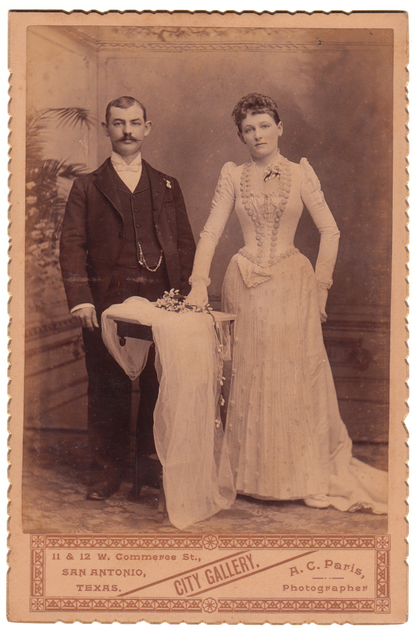 A. C. Paris, the proprietor of the City Gallery of San Antonio, Texas, produced this elegant wedding portrait . On the reverse of the cabinet card is an inscription stating “Alex Rossy, Josephine Fink’s father”. The cabinet card’s edges are gold embossed and scalloped. Census research reveals that the groom in this image, Alex Rossy (1862-1925) was the son of Charles and Aminda Rossy. Alex’s father was of Austrian ancestry. The 1880 US census reports that Alex was the fourth of seven children living in the Rossy’s home. San Antonio business directories assert that Alex’s occupation for many years was “Cigar Manufacturer”. Josephine Fink was actually Josephine Rossy Fink (1897-1980) and she was the daughter of Alex Rossy. She later became the wife of Lewis Fink.