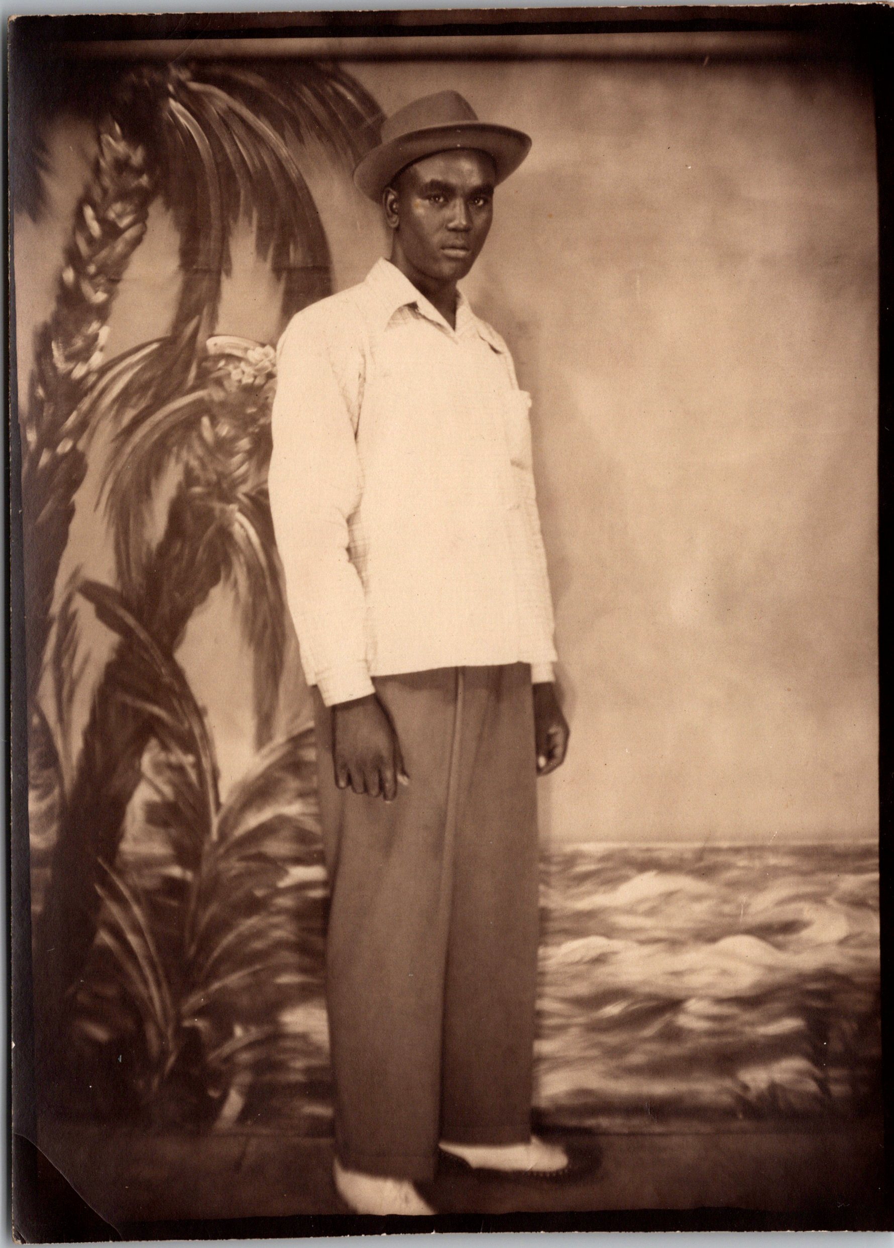 This three panel vintage photograph features a young African American man. He appears to be in his late teens and is nicely dressed in a suit and tie. Note his derby hat. Subject and photographer are not identified. The image was purchased in Austin, Texas and was part of a group of photographs described as the “San Antonio Collection”. The reverse of the photograph has residue that indicates it once resided in a scrap book or photo album. SOLD