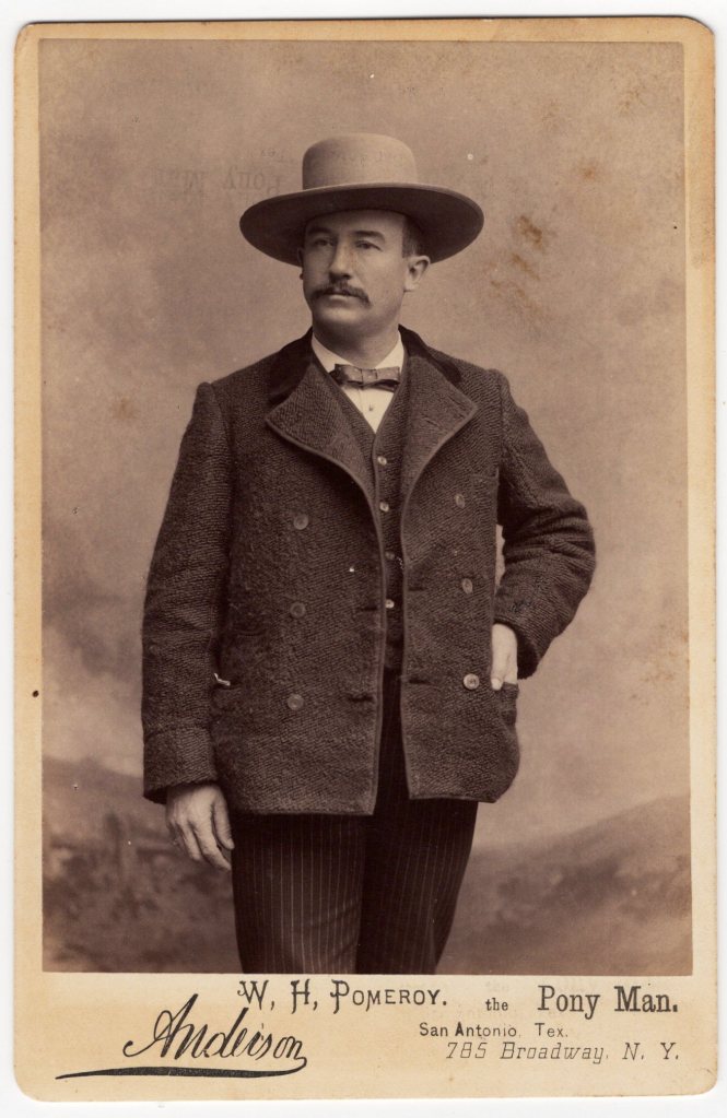 This cabinet card photograph features a handsome man posing for his portrait at the Anderson studio in New York City. A caption under the image identifies him as “W. H. Pomeroy, the Pony Man”. The caption also indicates that Pomeroy was from San Antonio, Texas. During the late 1880’s, Pomeroy owned “Pomeroy’s Western World Troupe” and “Pomeroy’s Western World Show”. Both were Wild West shows. The show was composed of more than 100 people and 125 horses, ponies, donkeys, and mules. The show also included a ten piece band. In 1891, Pomeroy partnered with Max Samuels, from San Antonio, to found a circus. The circus was called “Pomeroy & Samuel’s Great International Railroad Shows”. Pomeroy is well dressed and sports a nicely trimmed mustache. in this photograph. He is wearing a coarse wool coat and a matching waist coat. He is dressed in a crisp white shirt accentuated by a small silk bow tie. Atop his head is a flat crowned felt planter hat. There is something peeking out of his left jacket pocket. Mr. Pomeroy is posing in front of a backdrop. The photographer of this image was D. H. Anderson who operated a studio on Broadway in New York City. Anderson used the same photo studio formerly occupied by the famed photographer, Matthew Brady. Anderson had worked in various other American cities before moving to New York in 1881. He became known as a talented celebrity photographer. This photograph has an interesting aberration. If you look very closely in the sky next to the left side of his hat (slightly above the brim), you can see the words “Pony Man”. The words are very light and upside down. This developing error occurred more than one hundred years ago. SOLD